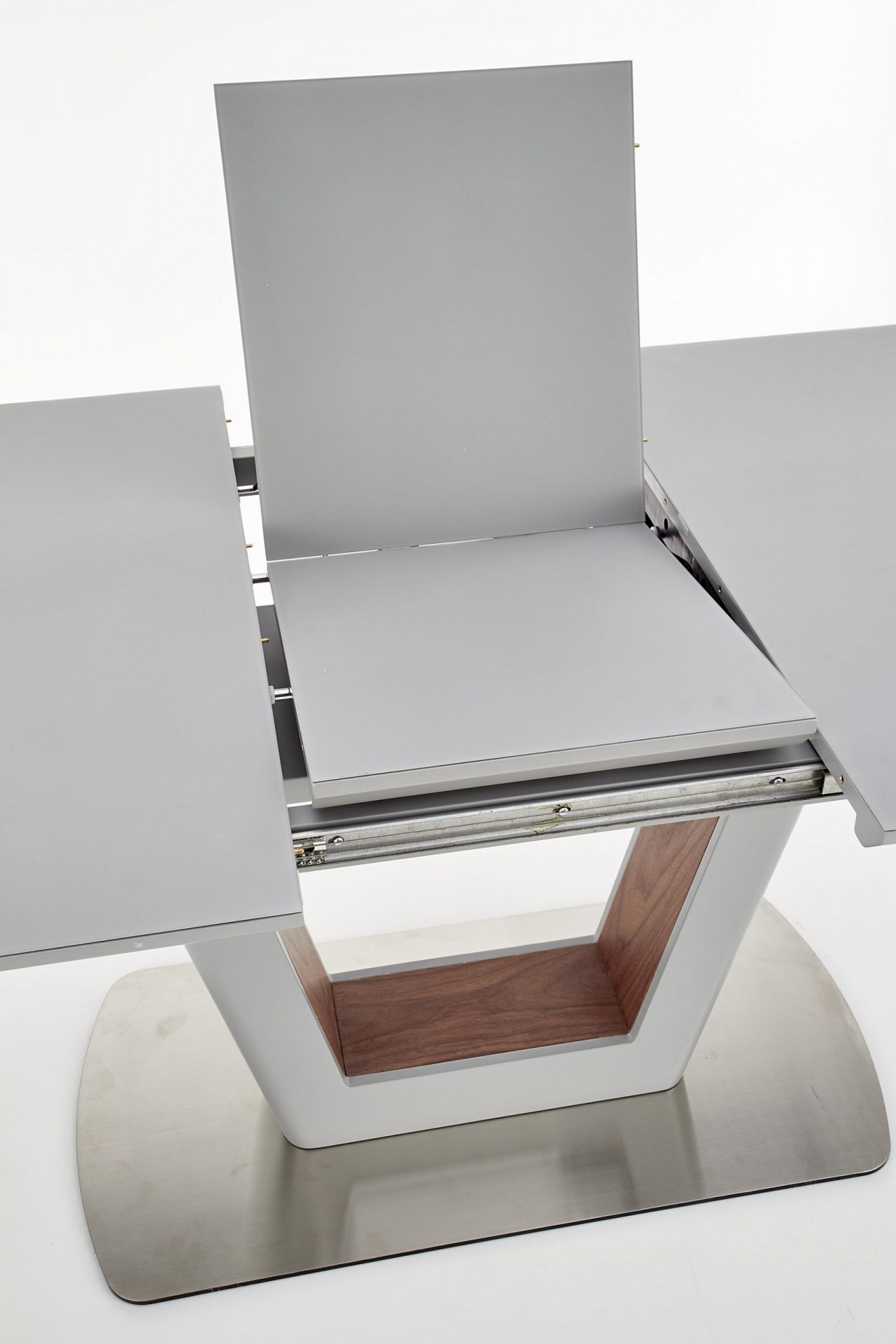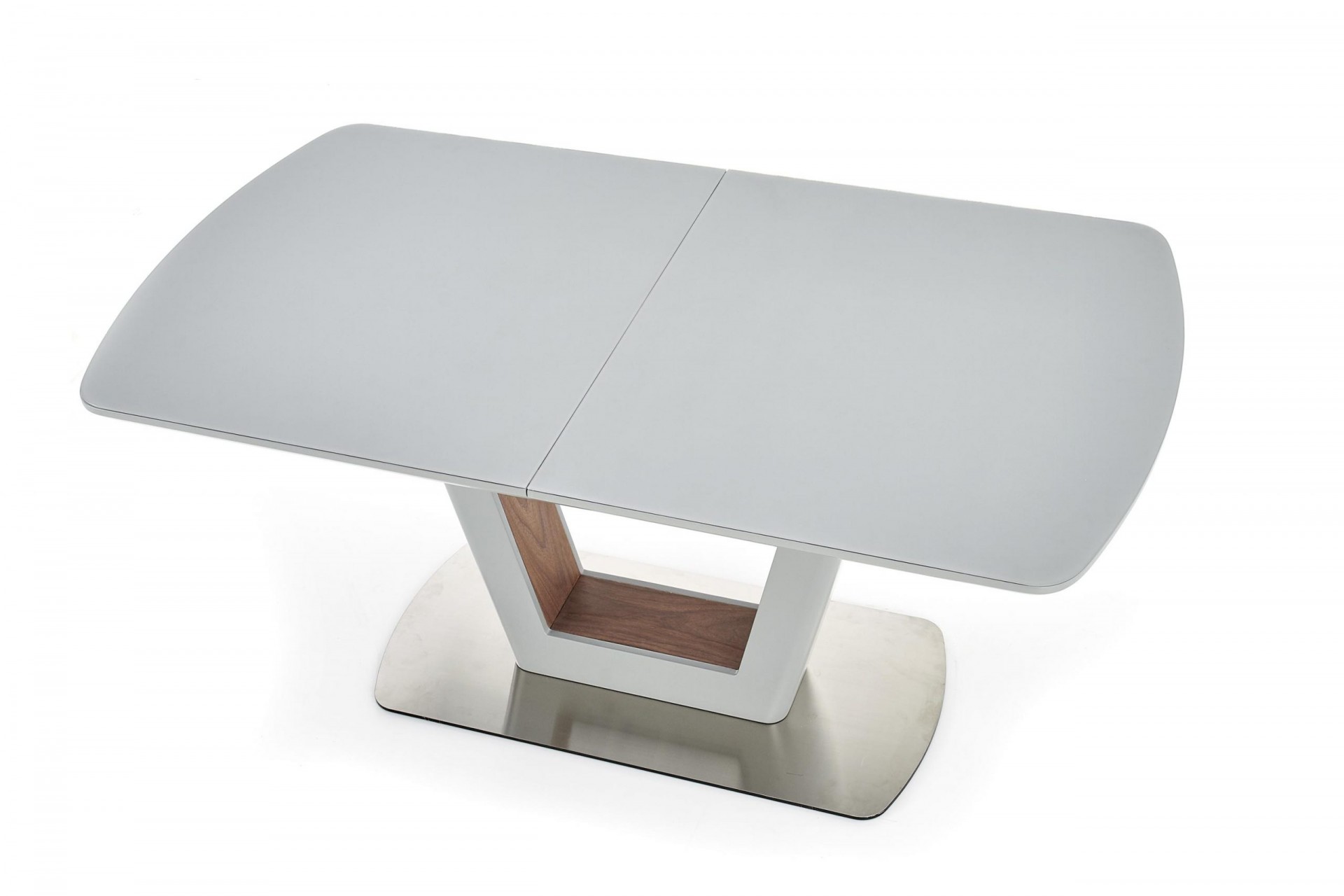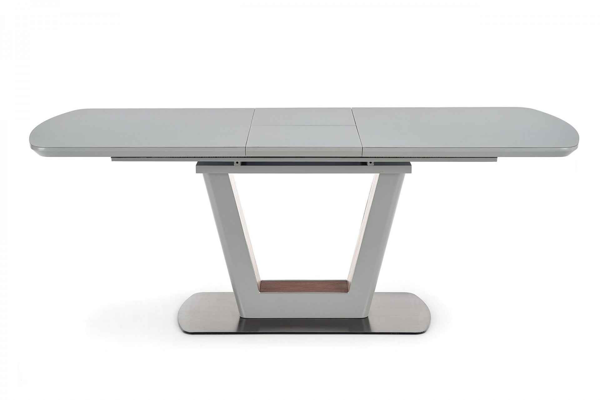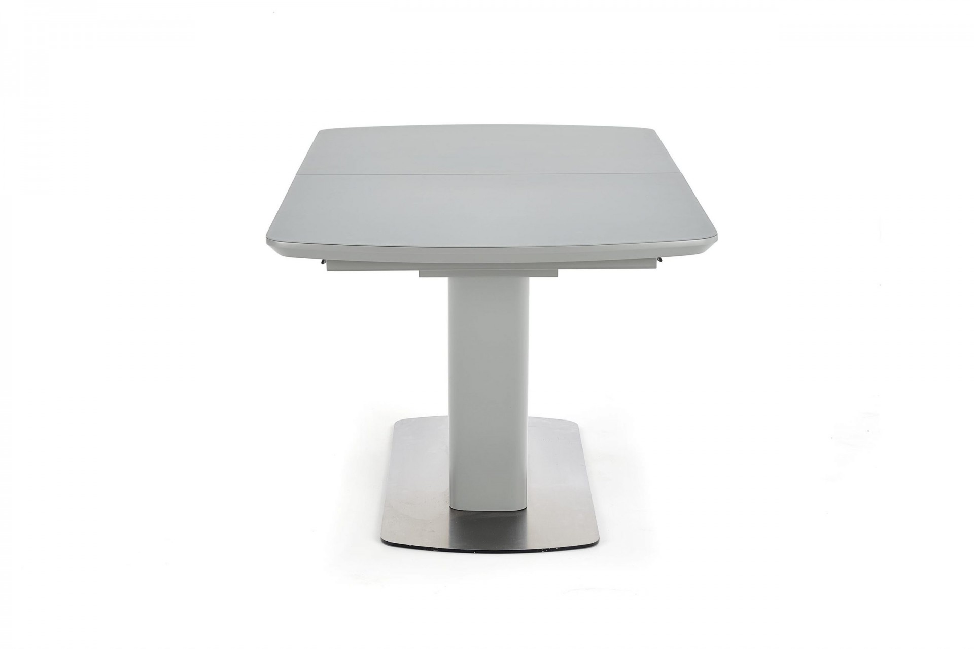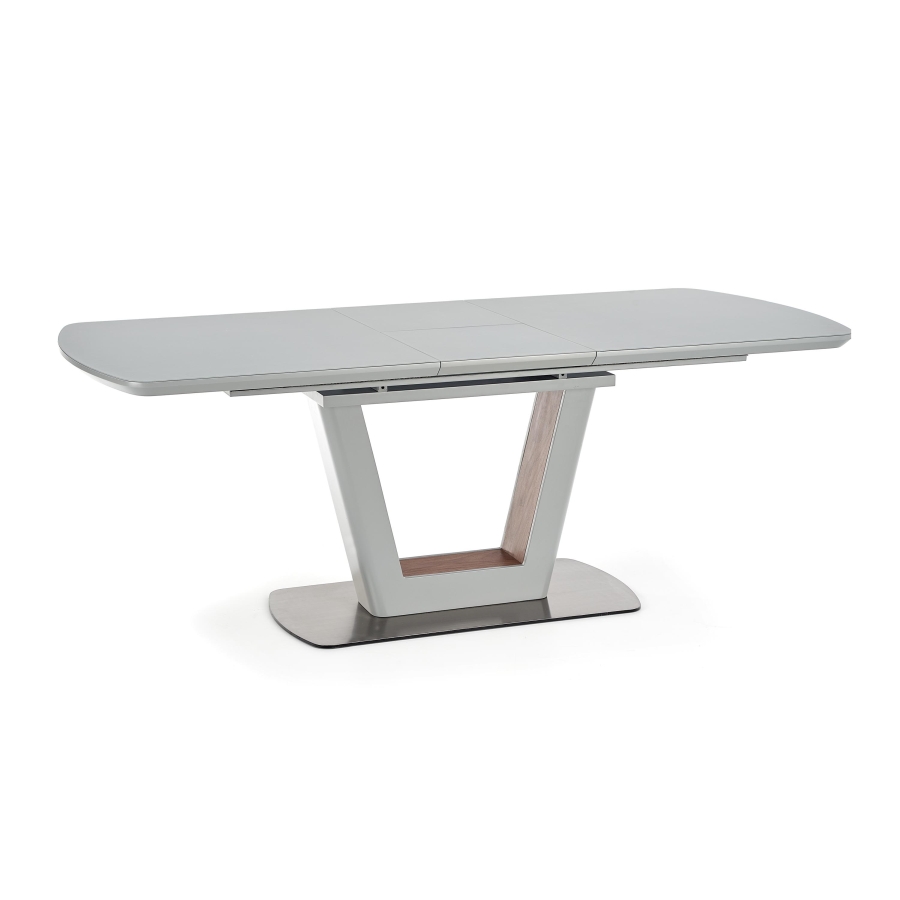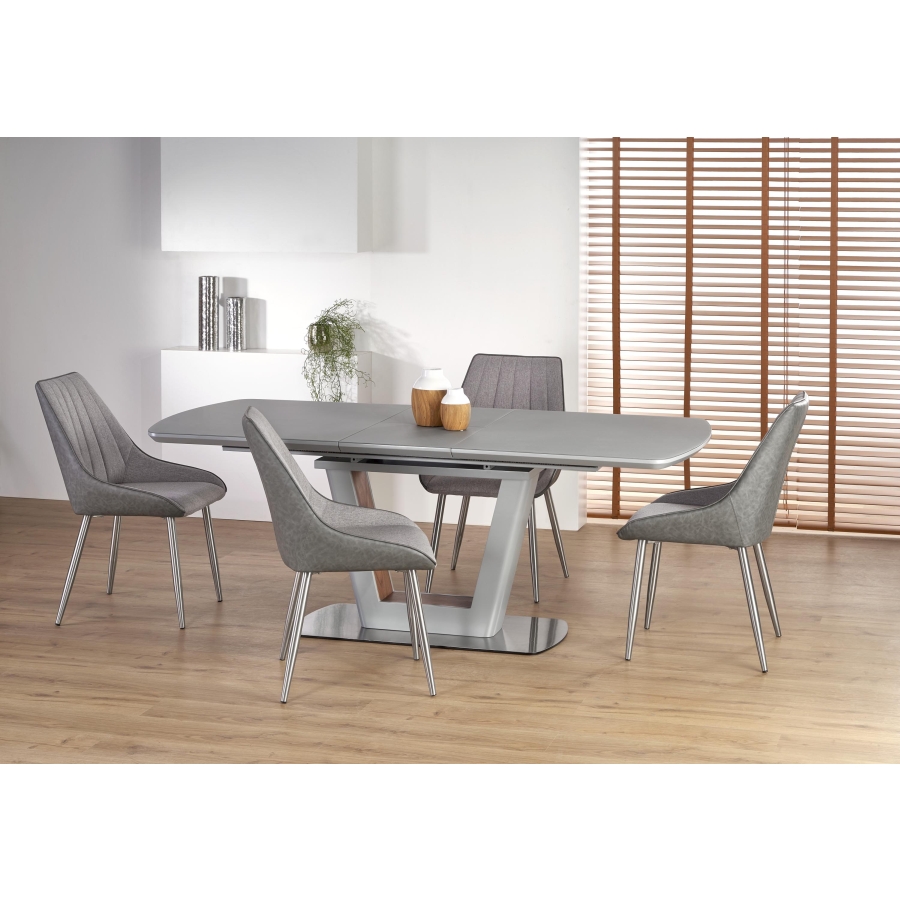Modern, matt, bővíthető étkezőasztal, rozsdamentes acél vázzal, szürke színben.