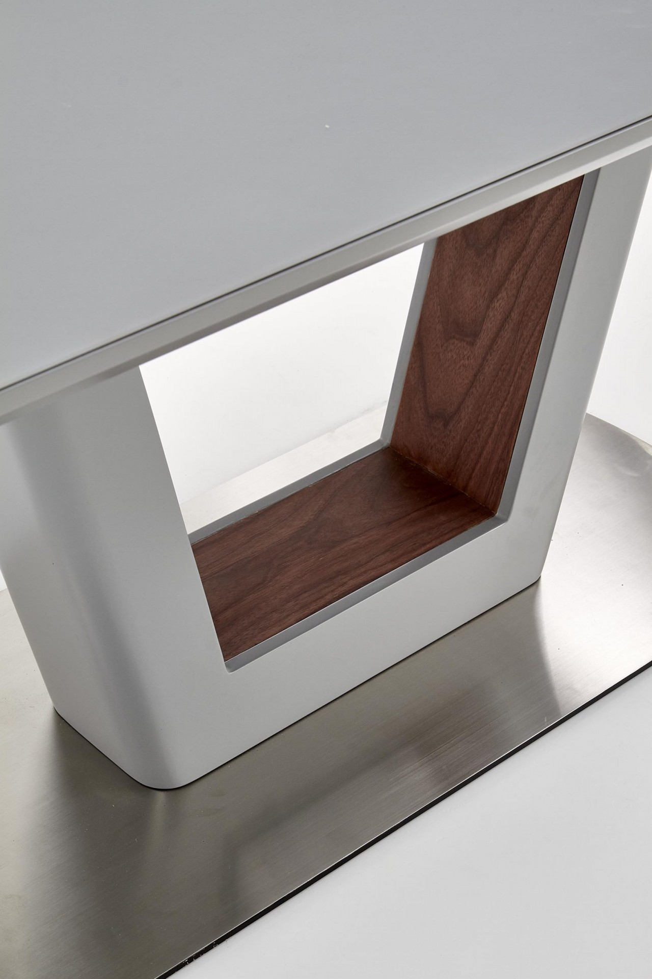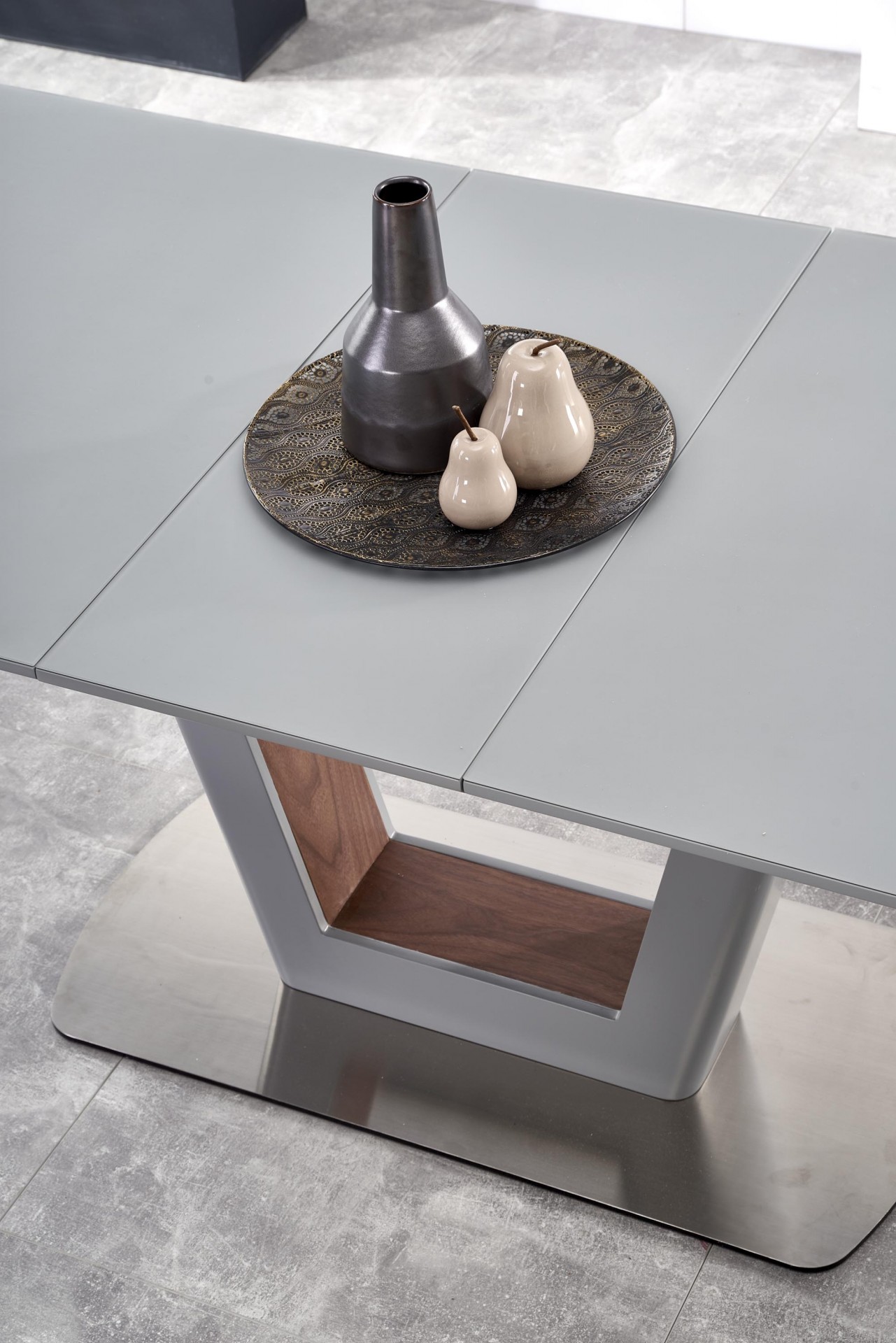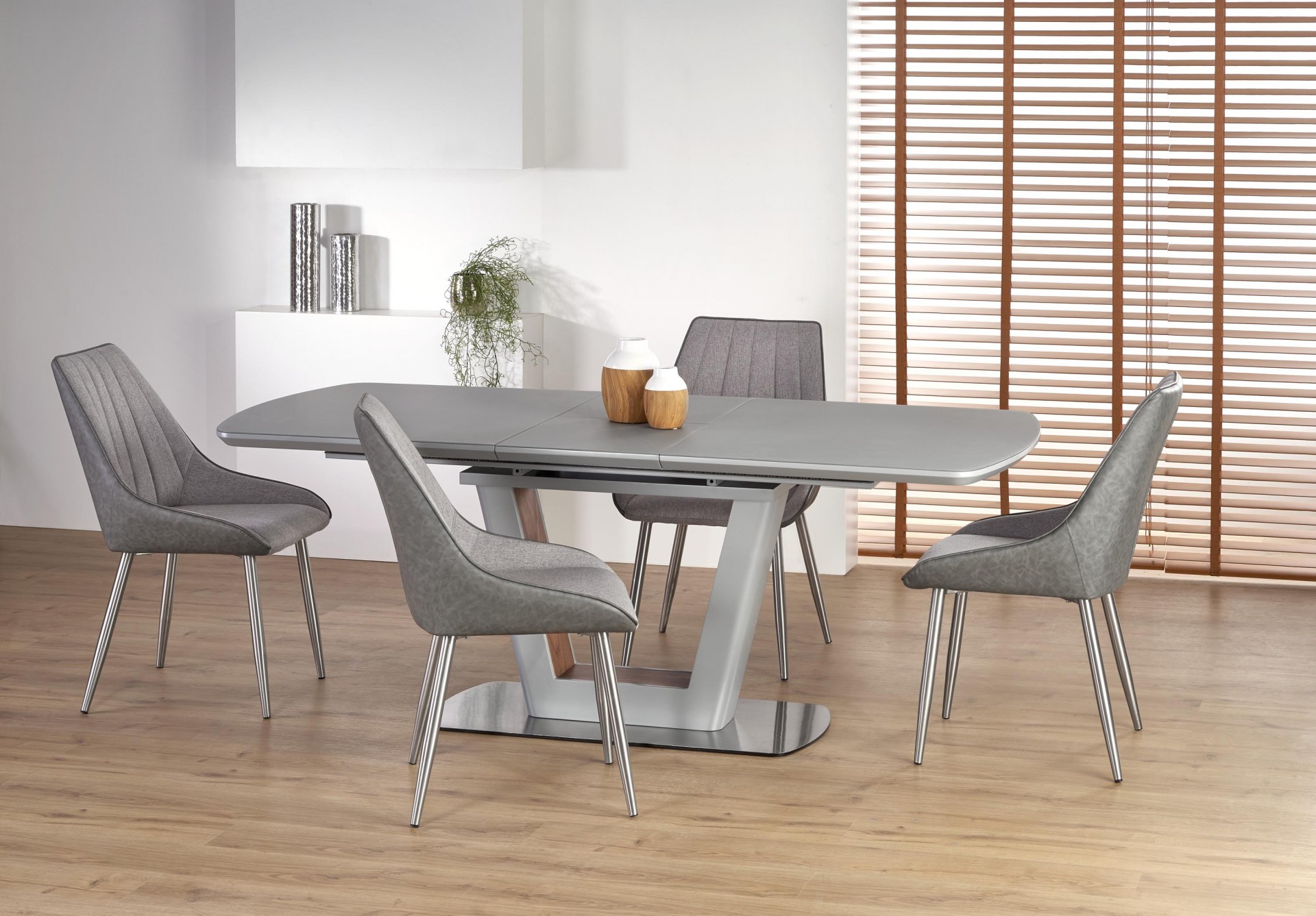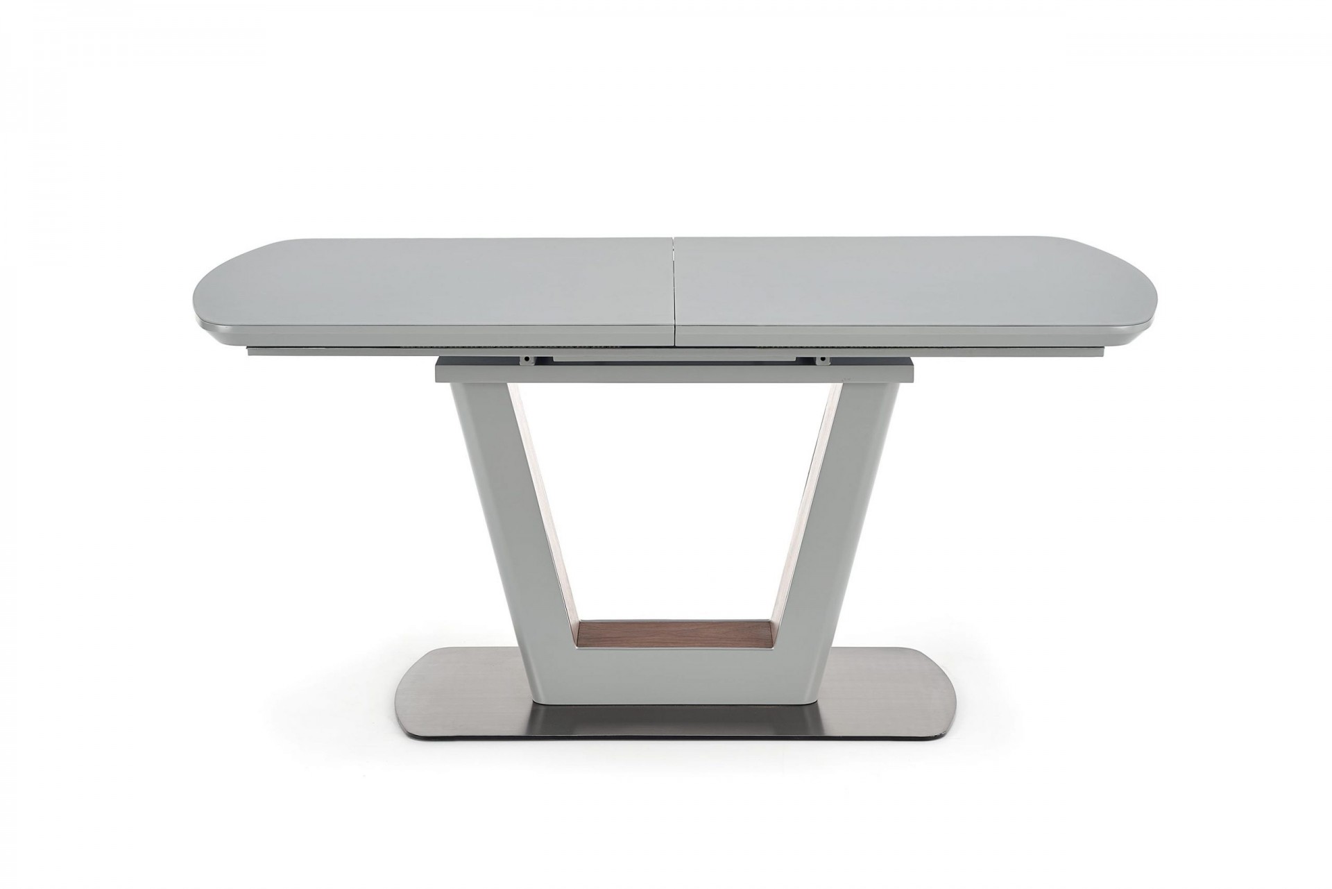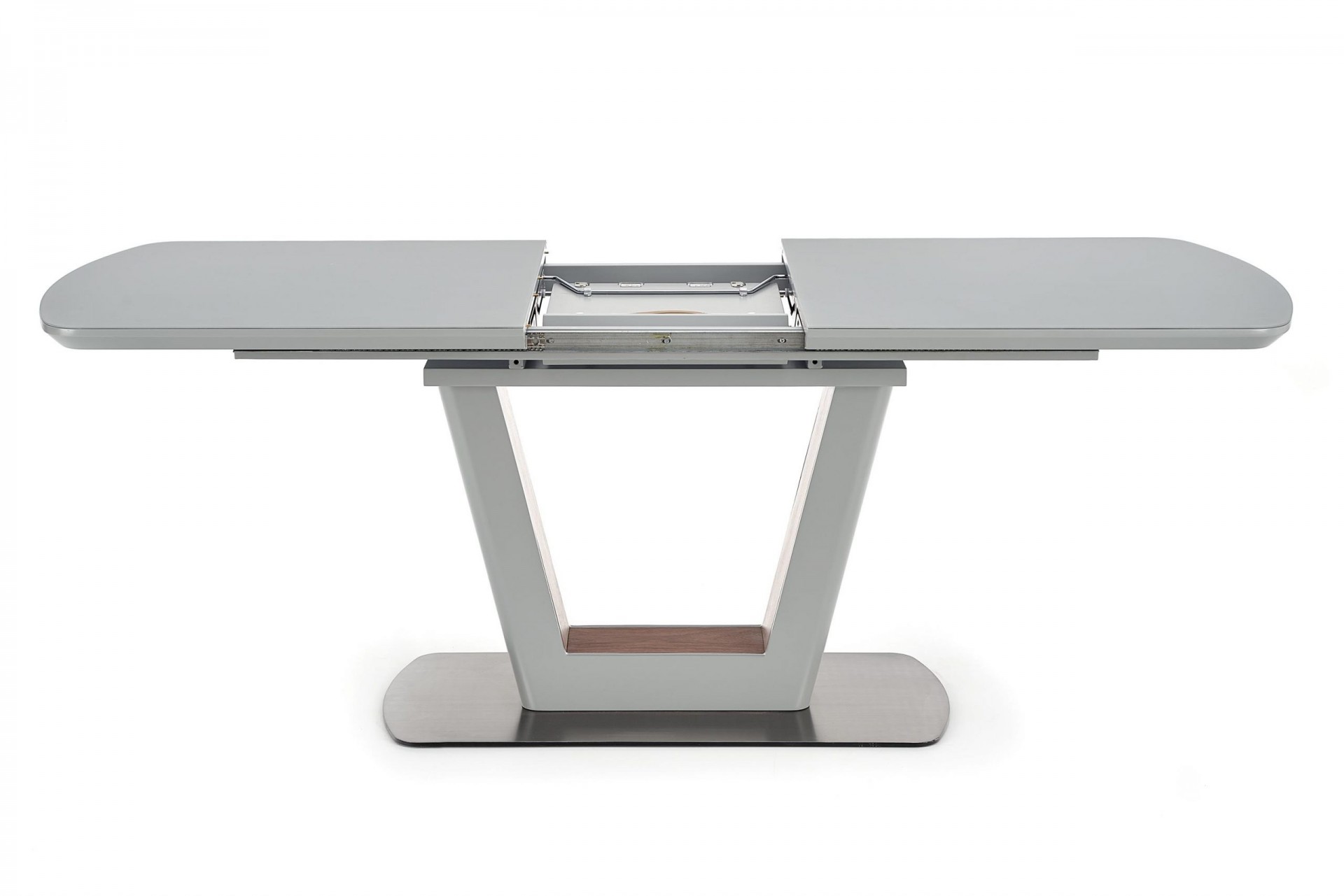Modern, matt, bővíthető étkezőasztal, rozsdamentes acél vázzal, szürke színben.