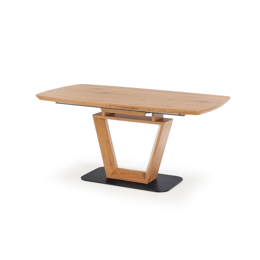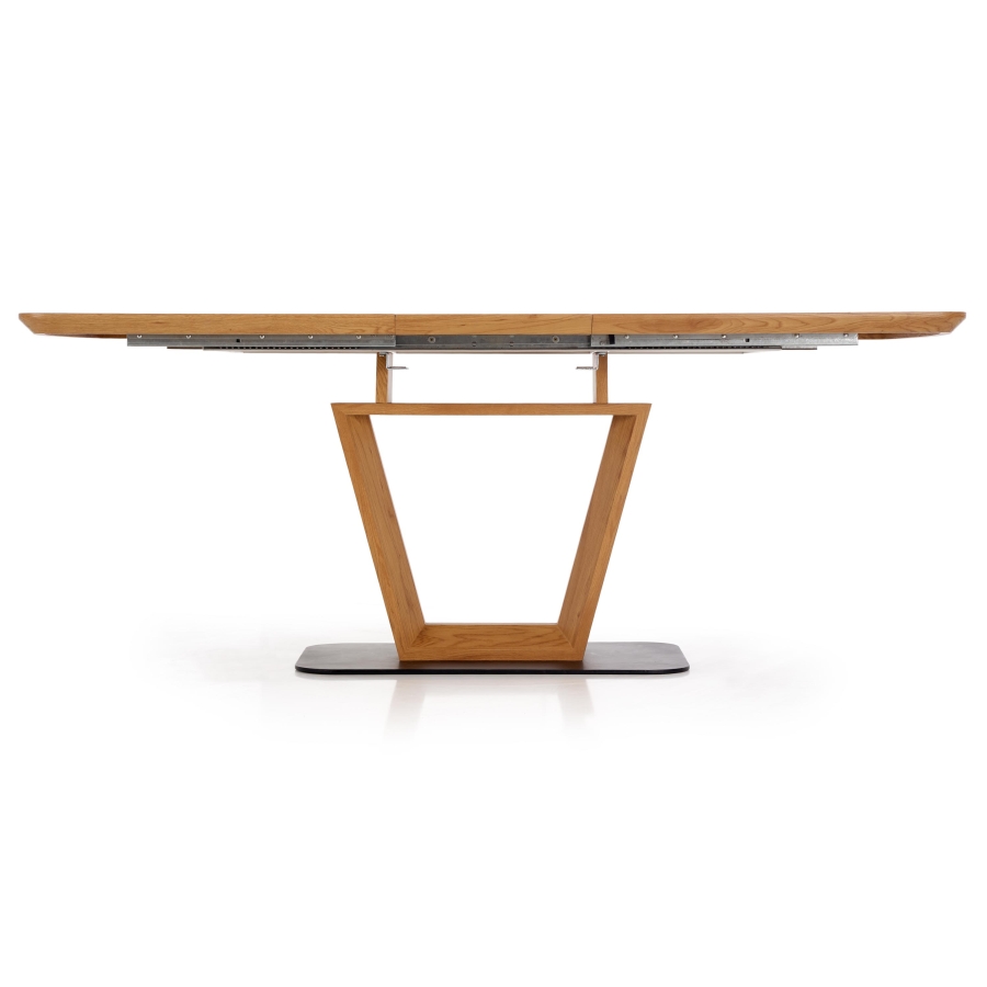 Modern, bővíthető, központi lábas étkezőasztal porszórt acél vázzal.