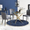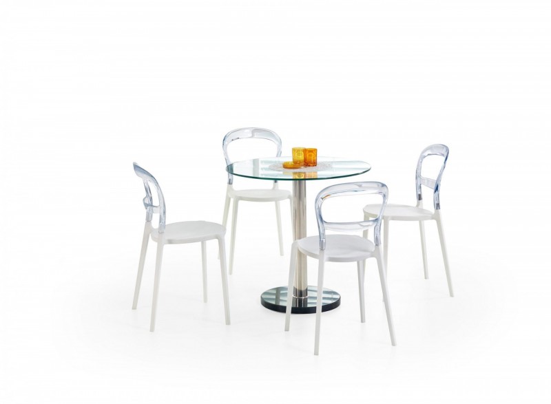 Kis méretű, kör alakú, üveglapos étkezőasztal krómacél vázzal, trendi márvány hatású talpazattal.