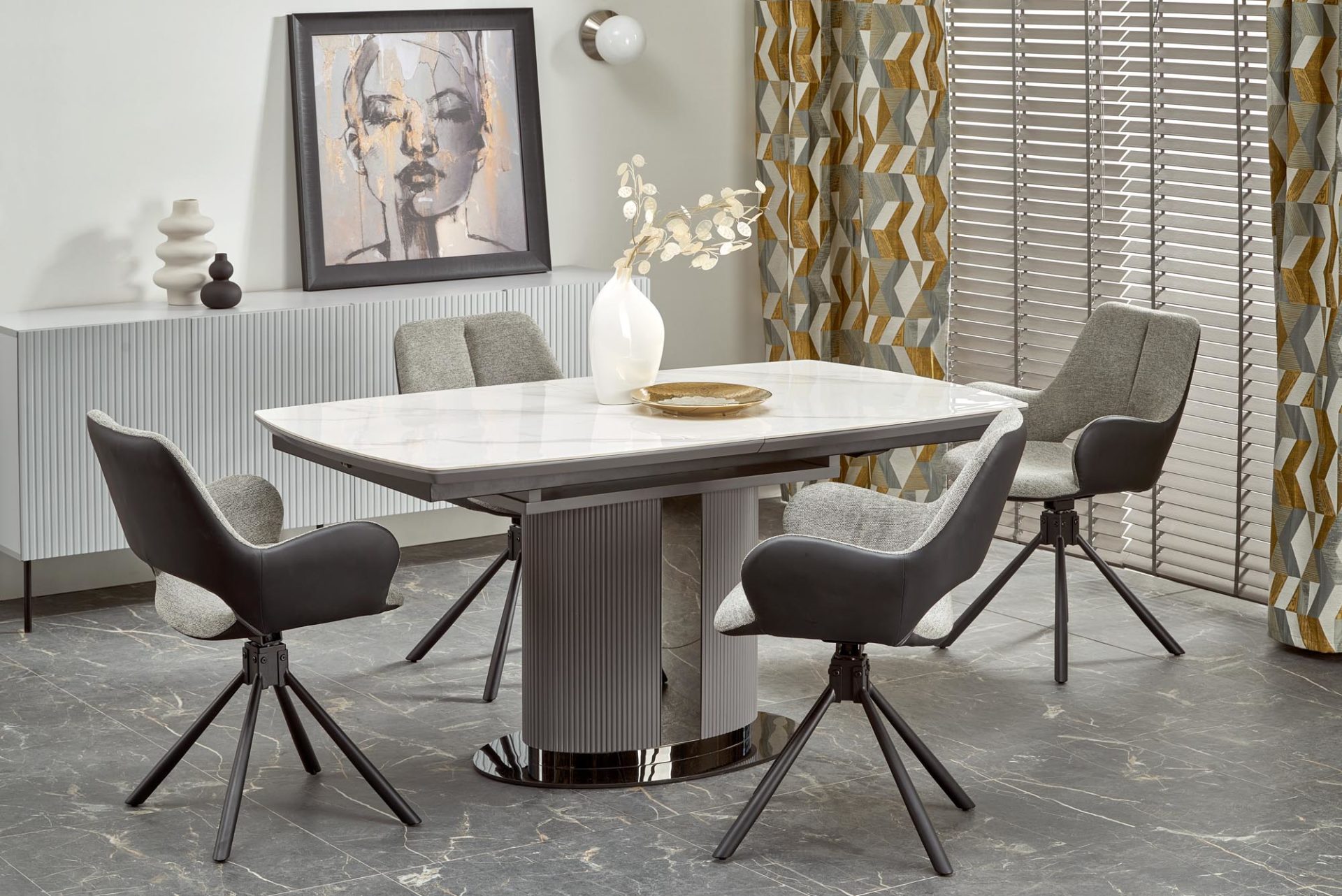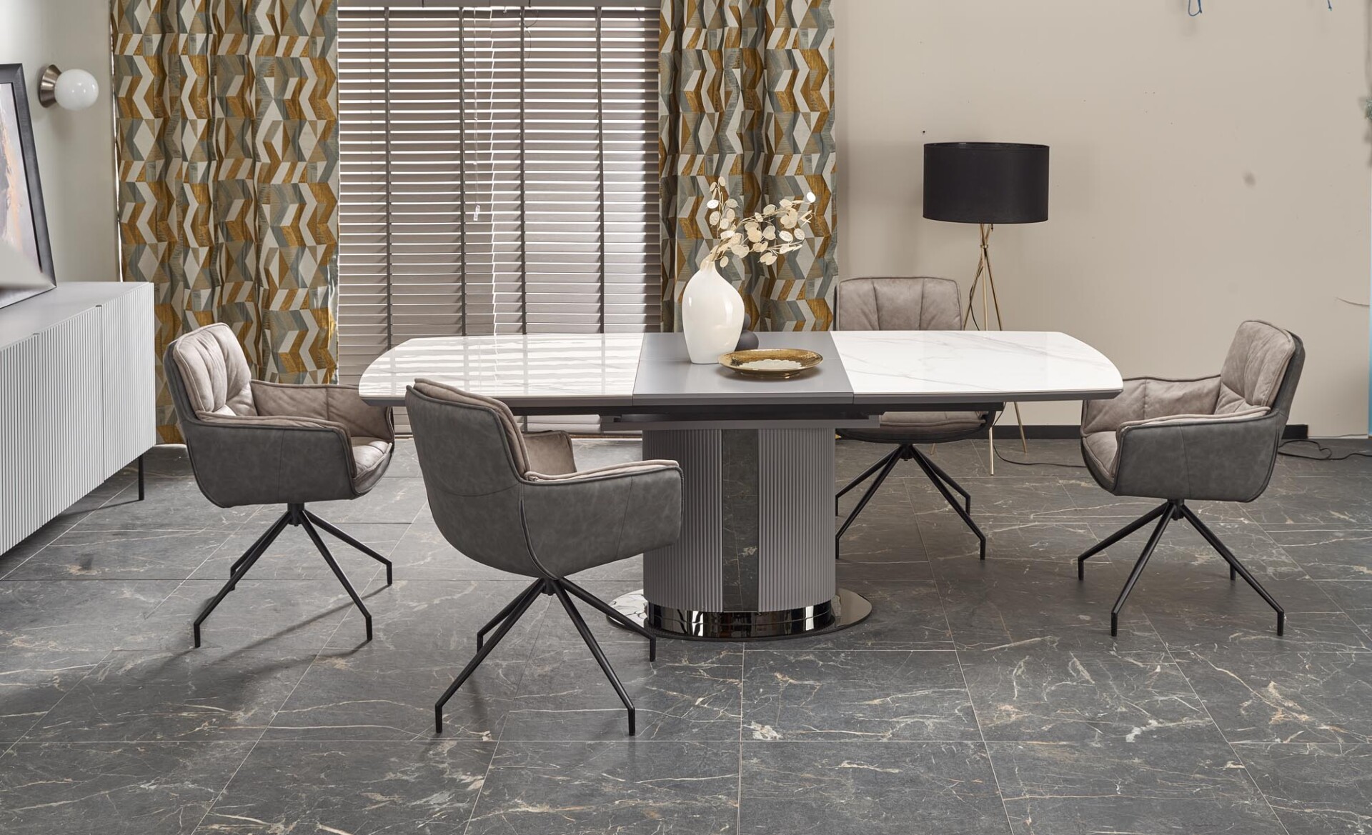 Bővíthető étkezőasztal márványhatású (kerámia) fehér színű lappal.