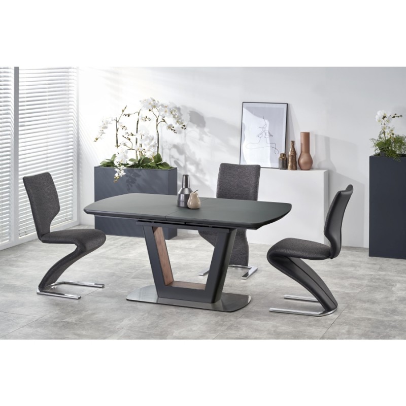 Modern, matt üveglapos, bővíthető étkezőasztal, rozsdamentes acél vázzal.