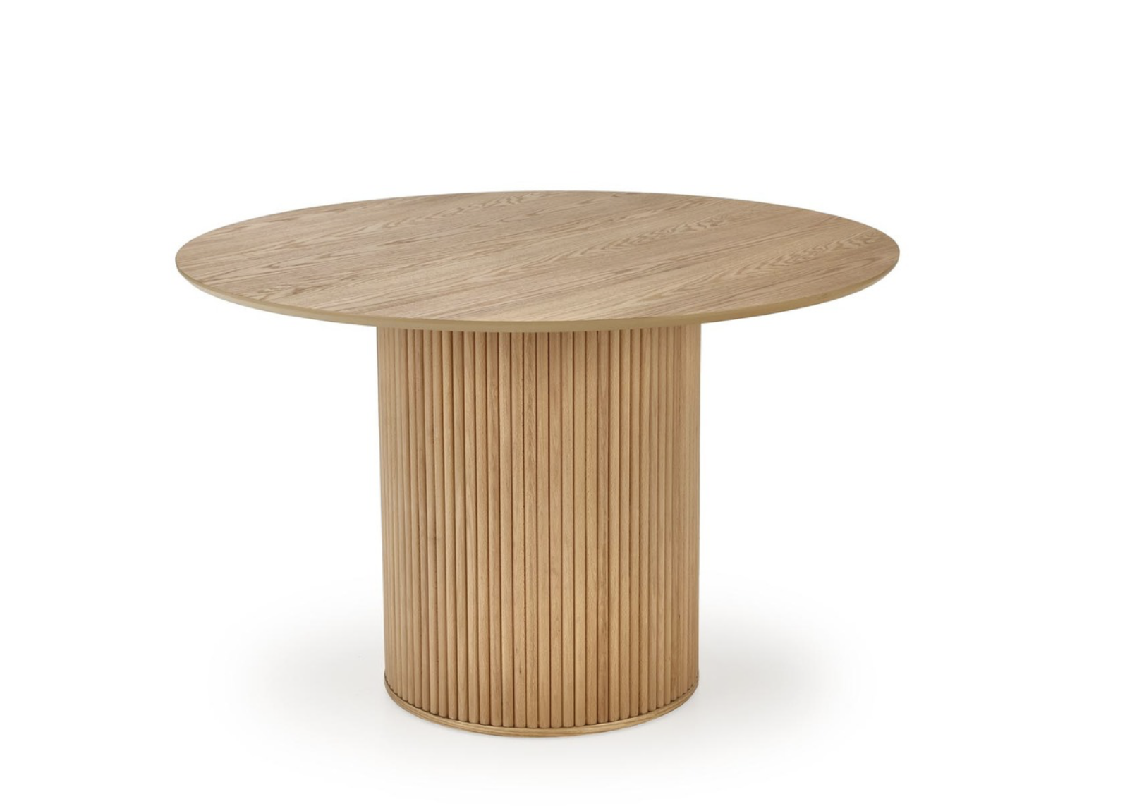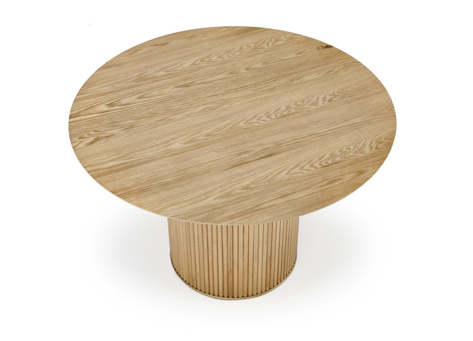 Modern kerek étkezőasztal tölgy színű MDF asztallappal és vázzal.