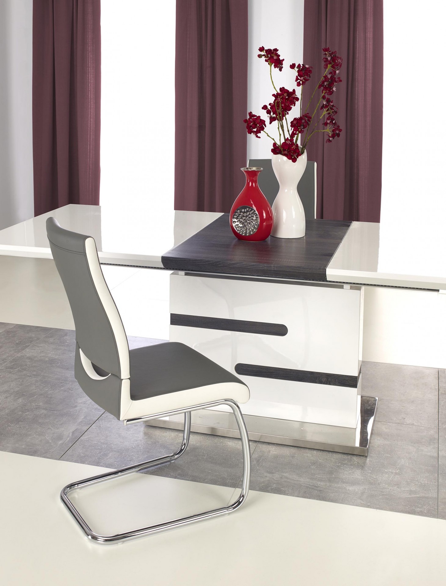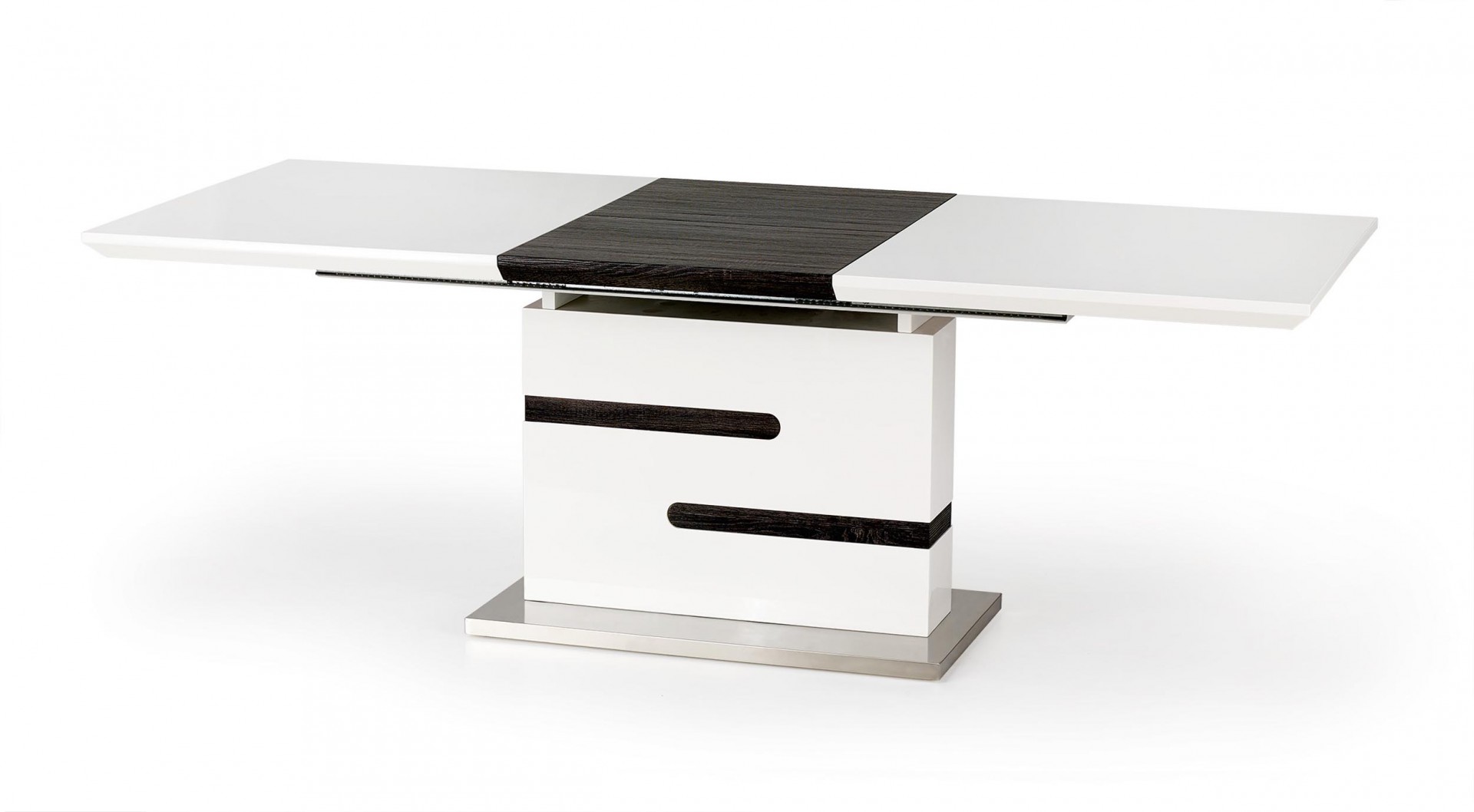 Modern, magasfényű fehér, központi lábas bővíthető étkezőasztal, rozsdamentes acél vázzal.