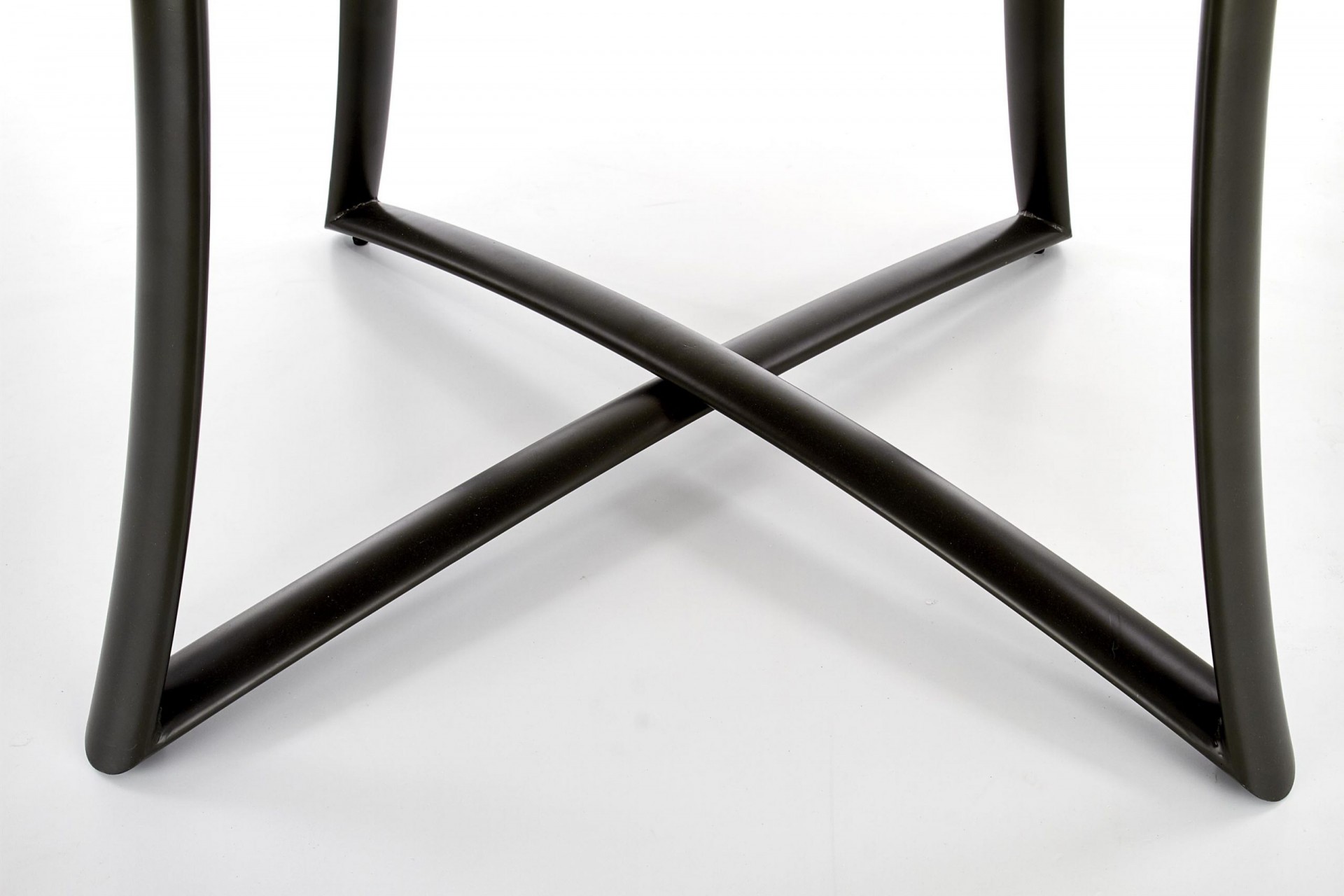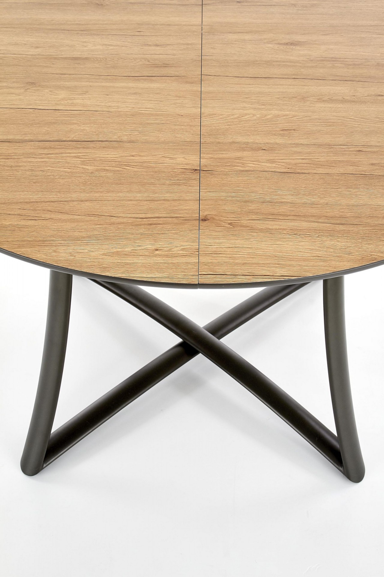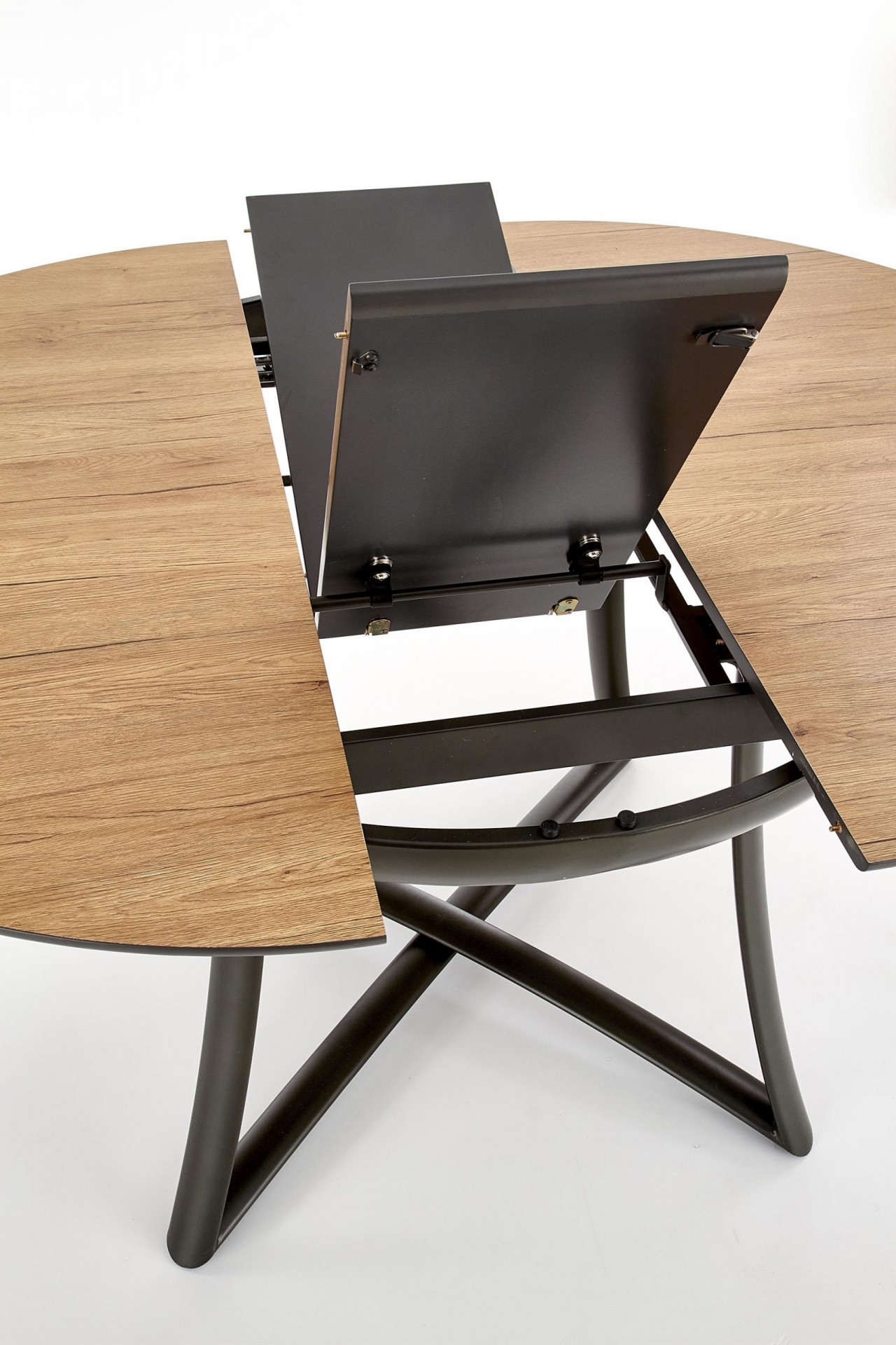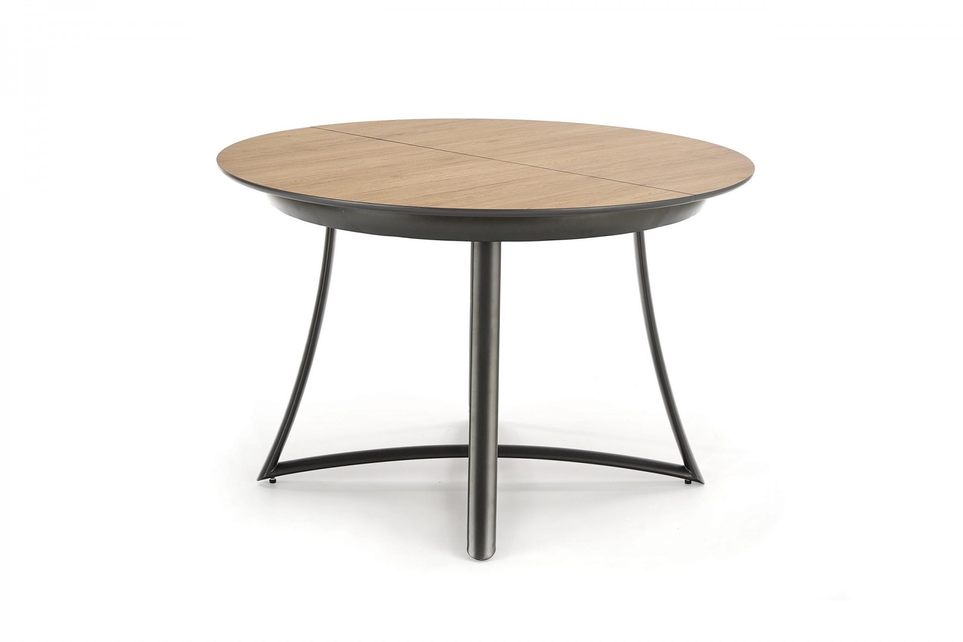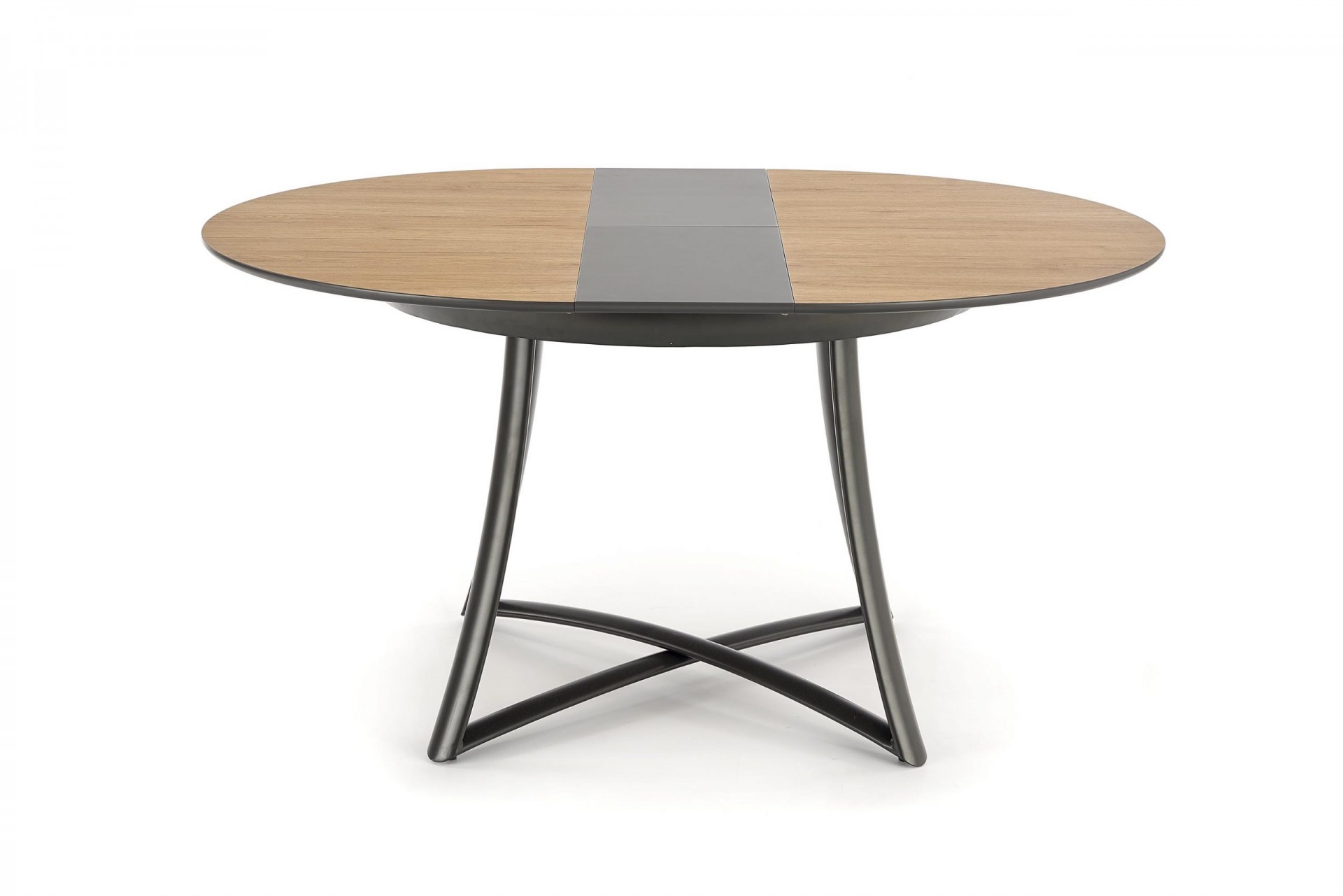 Kör alakú, bővíthető étkezőasztal, porszórt acél lábazattal.