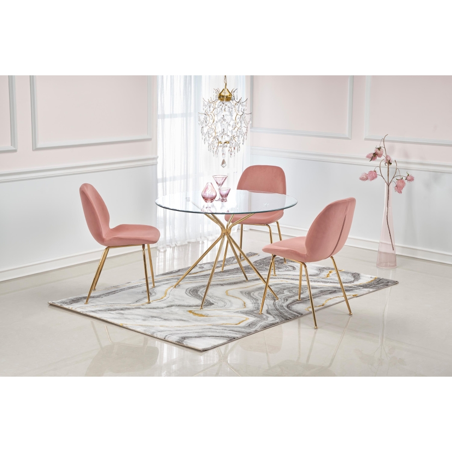 Trendi kör alakú, üveglapos étkezőasztal arany színű krómacél vázzal.