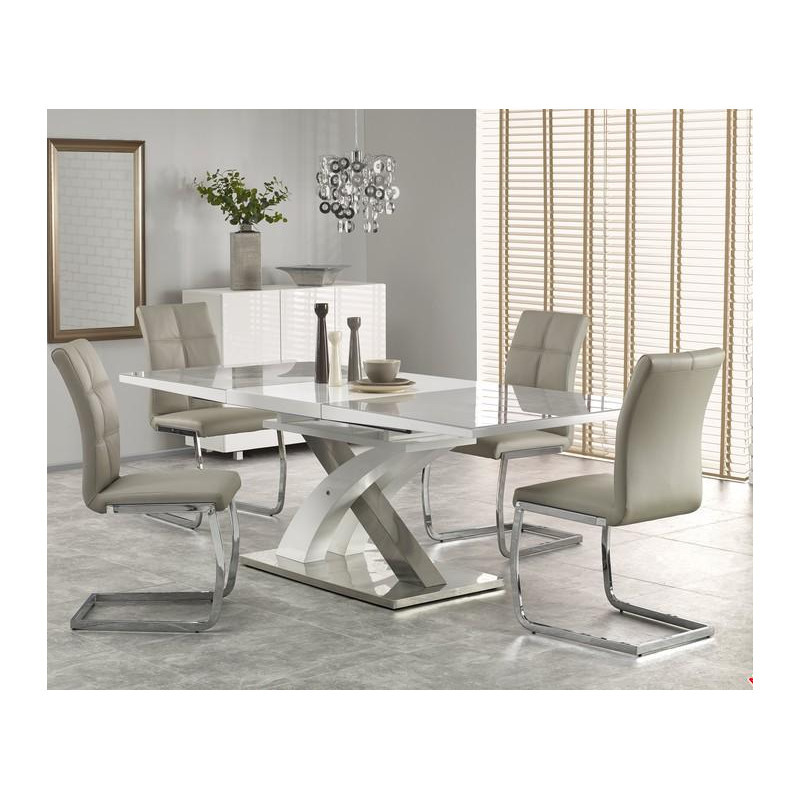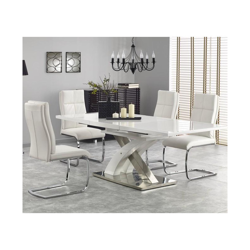 Modern, bővíthető, üveglapos, központi lábas étkezőasztal, krómozott acél vázzal, háromféle színösszeállításban.