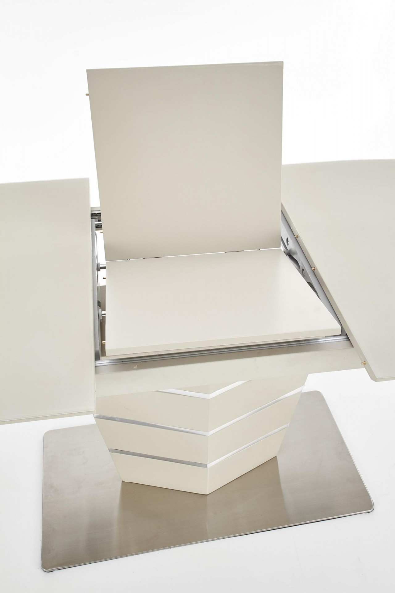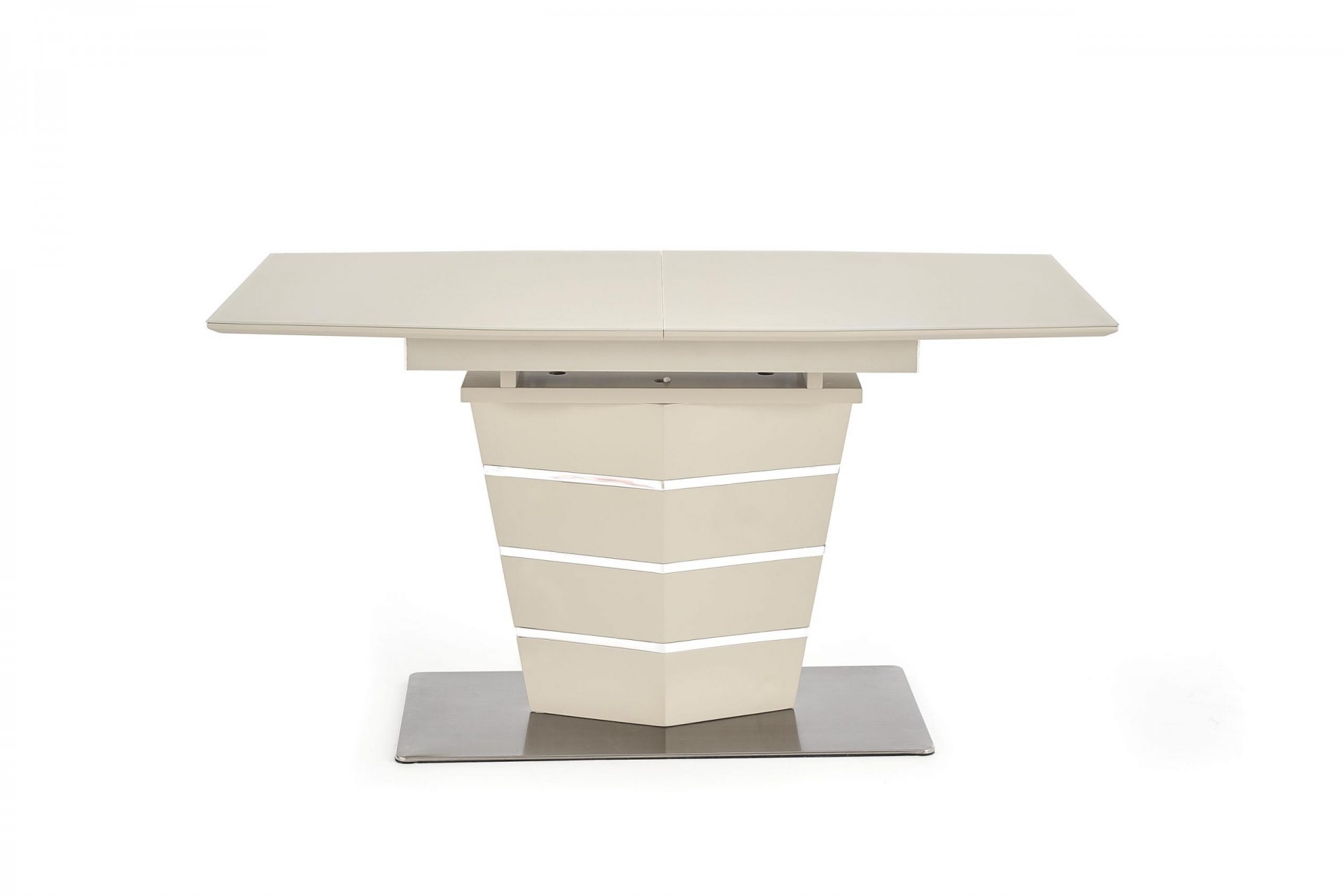 Trendi, elegáns vonalvezetésű, központi lábas bővíthető étkezőasztal üveglappal, rozsdamentes acél vázzal.