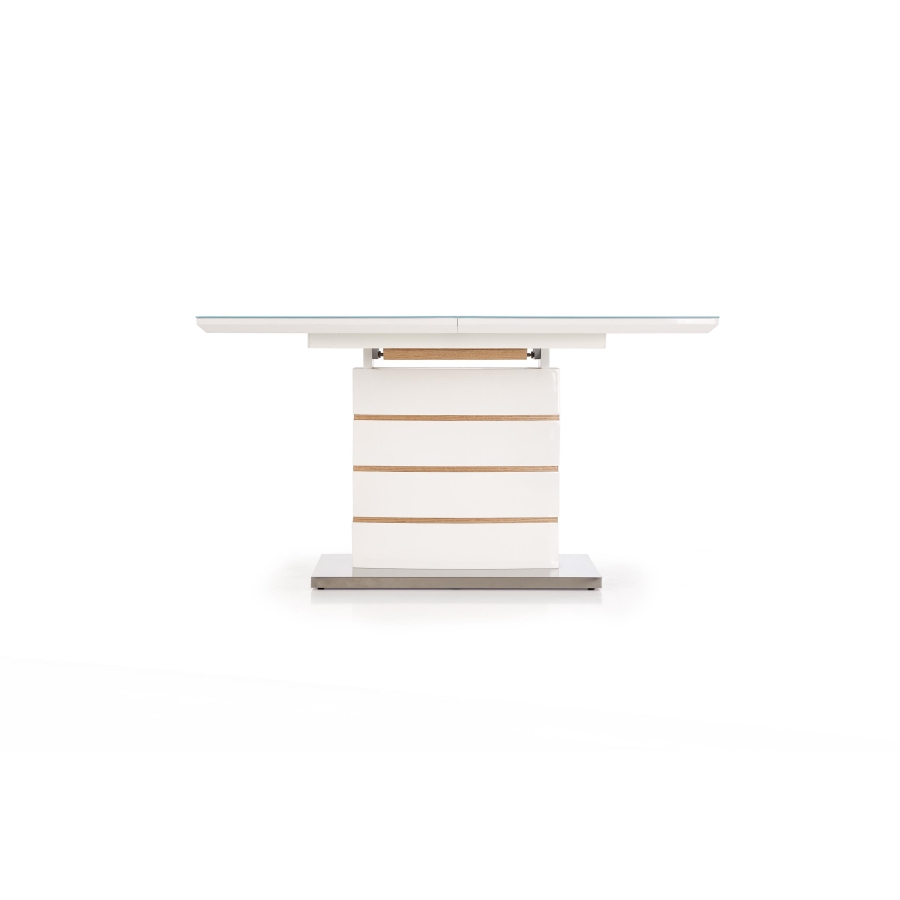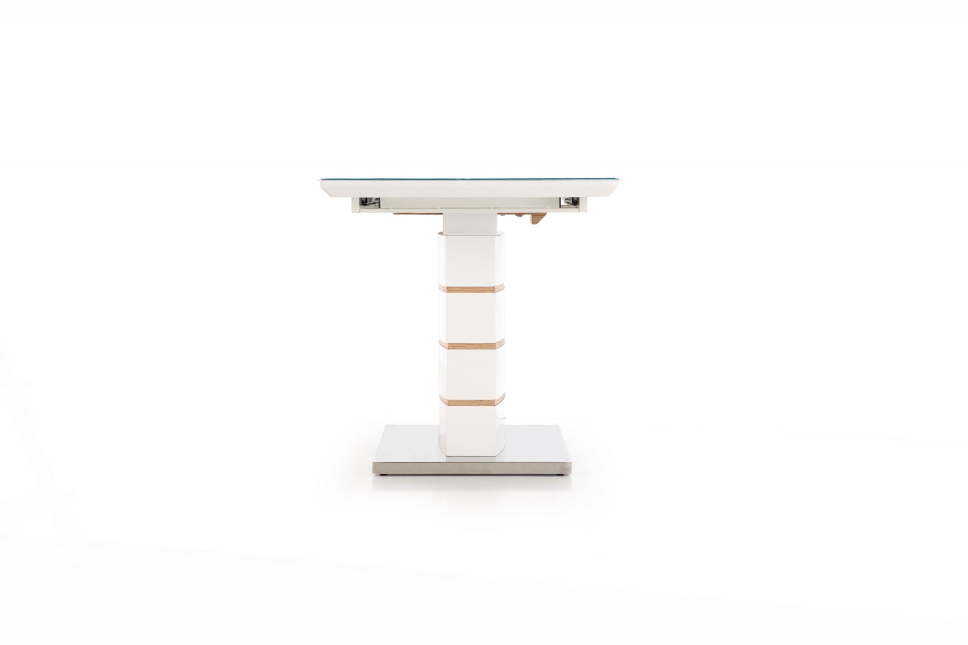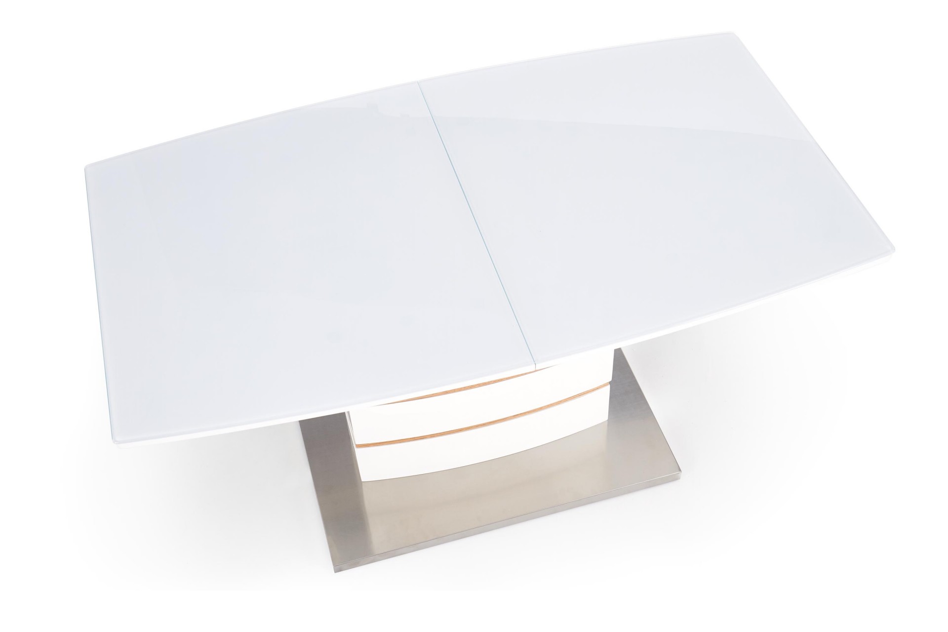 Modern, bővíthető, központi lábas étkezőasztal, üveglappal, rozsdamentes acél vázzal.