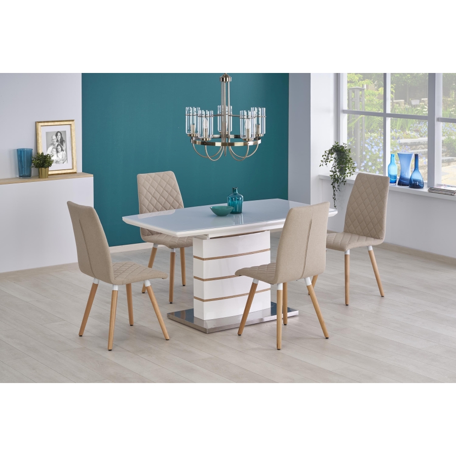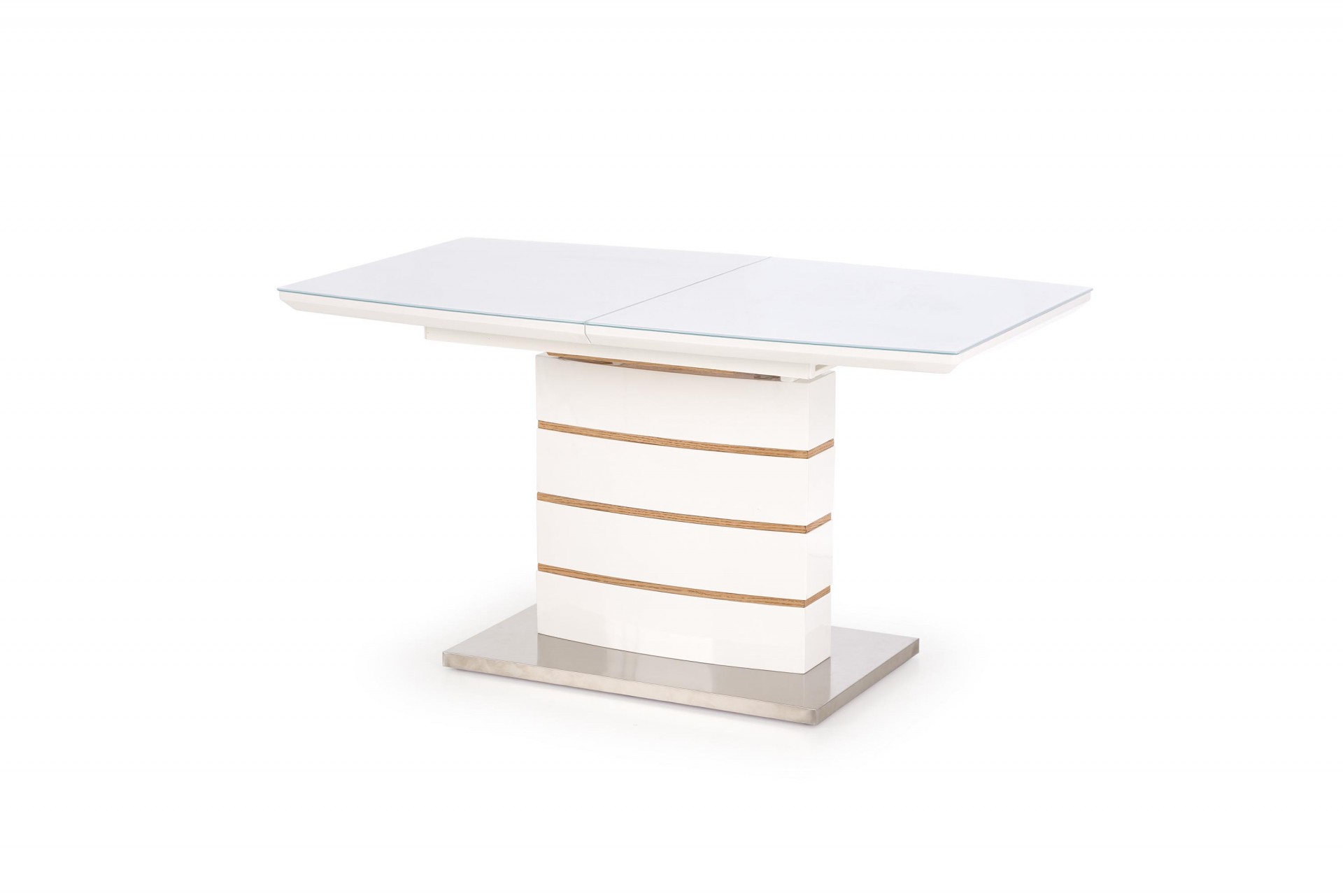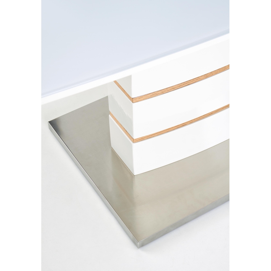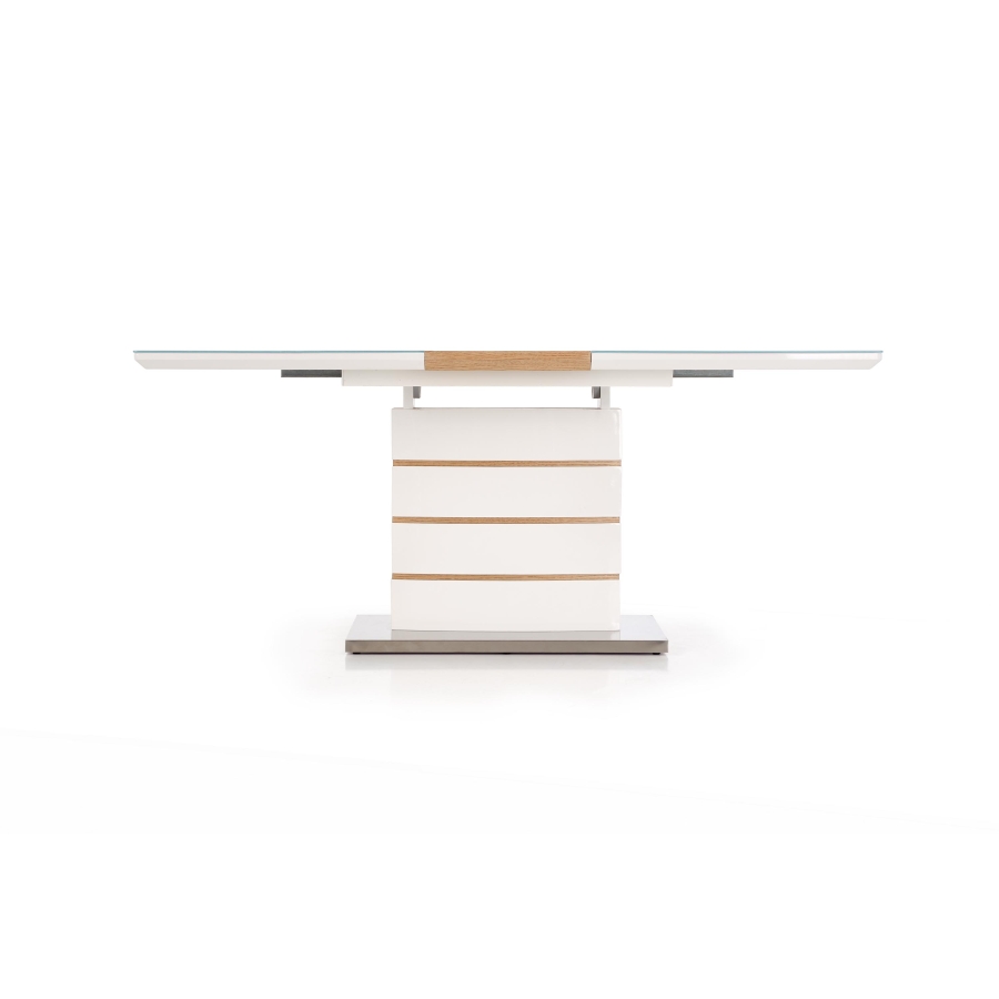 Modern, bővíthető, központi lábas étkezőasztal, üveglappal, rozsdamentes acél vázzal.