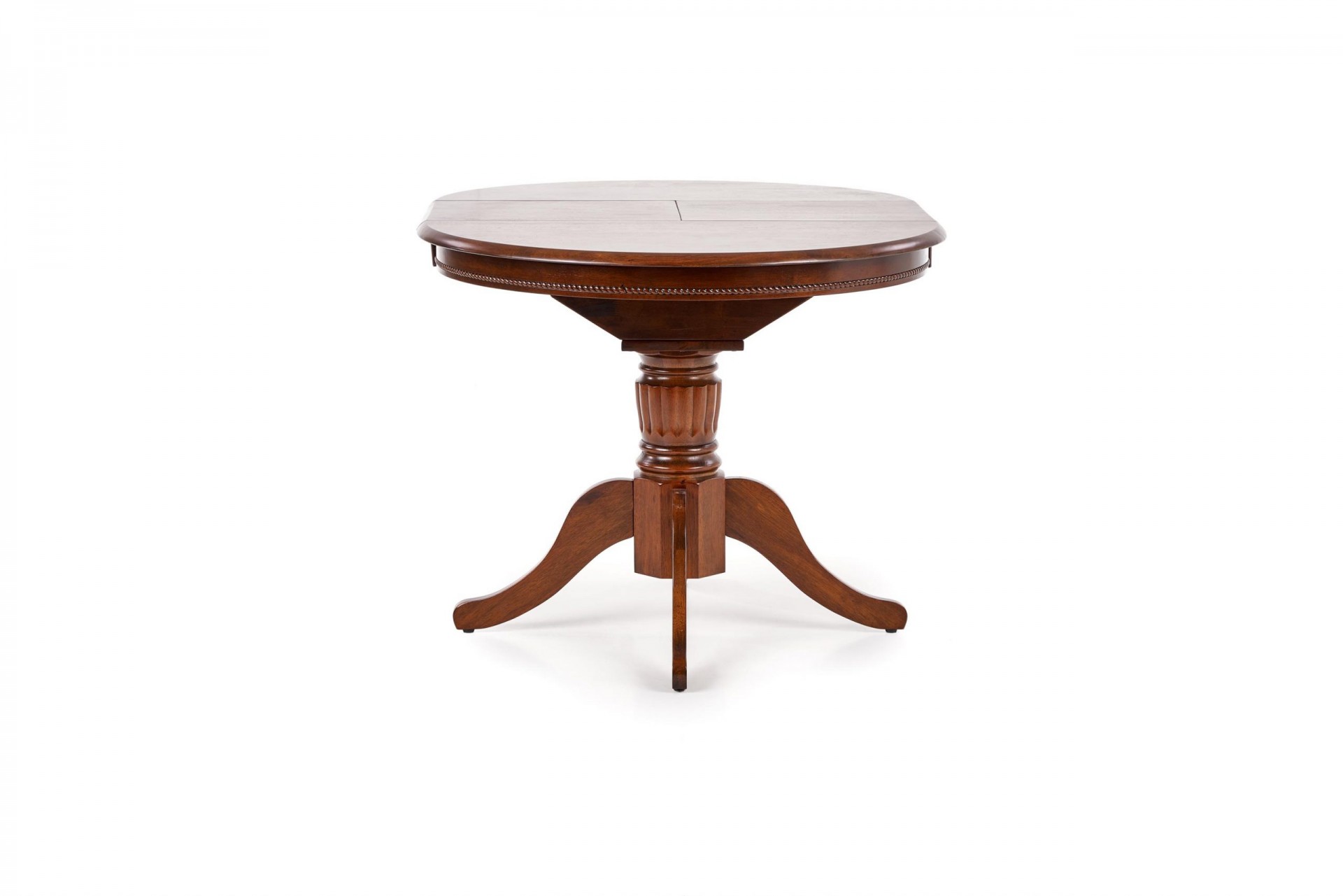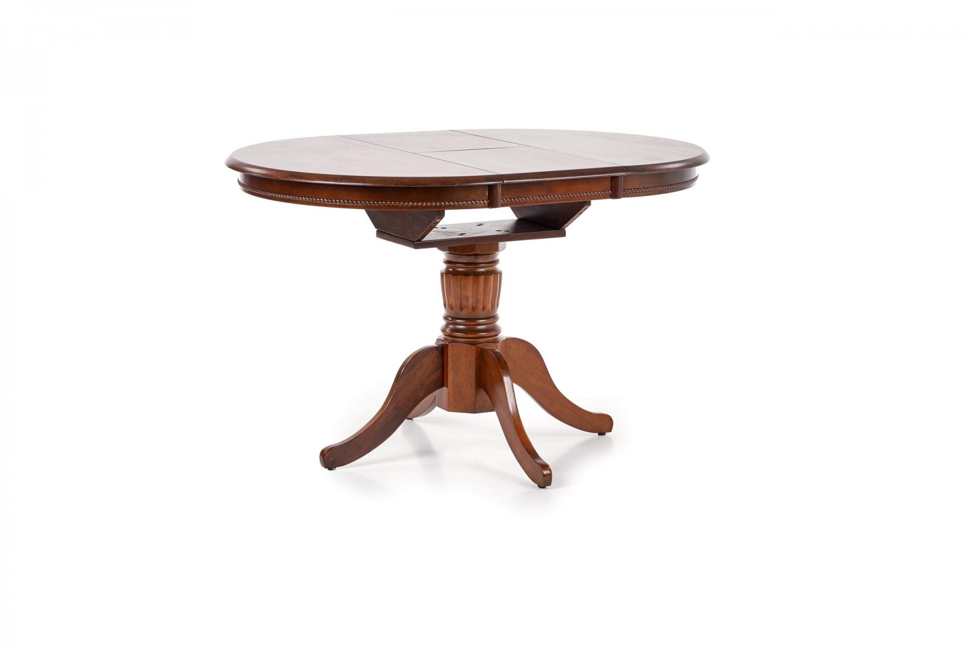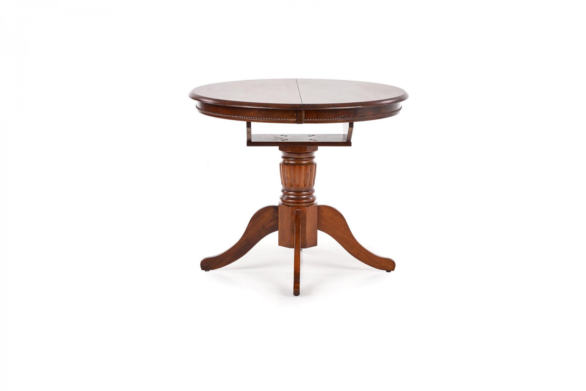 Klasszikus stílusú, kör alakú, bővíthető fafurnéros étkezőasztal tömörfa központi lábbal.