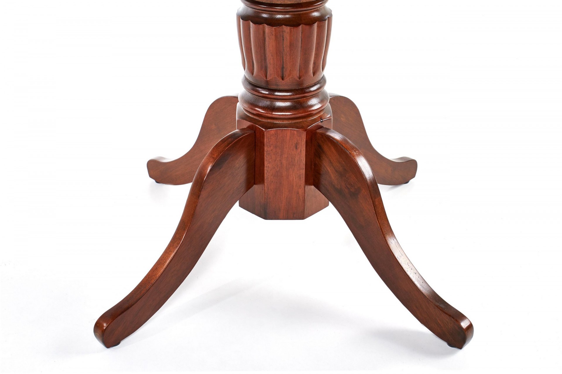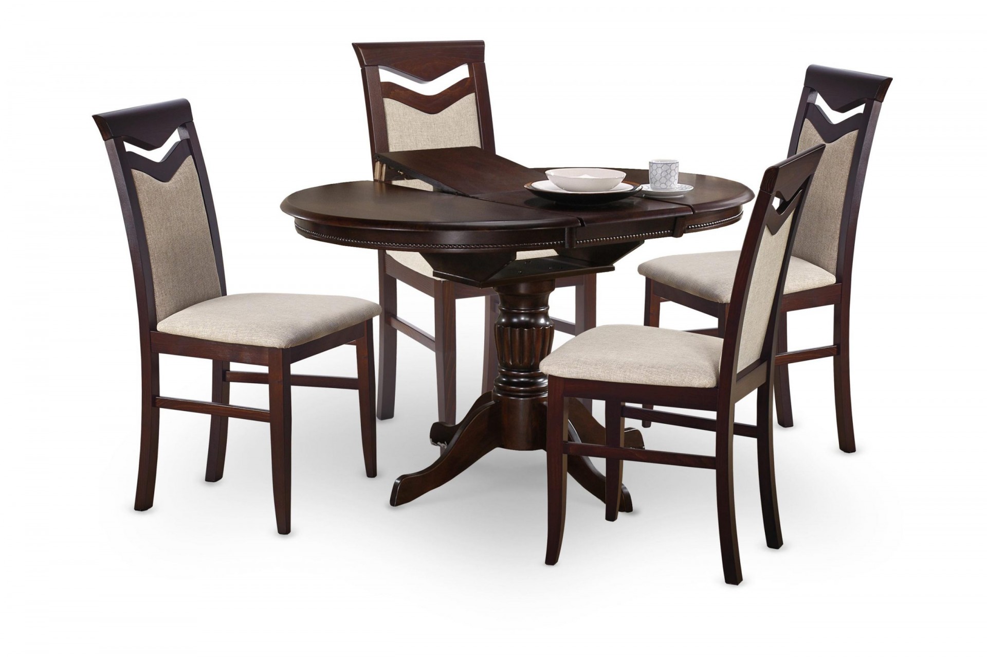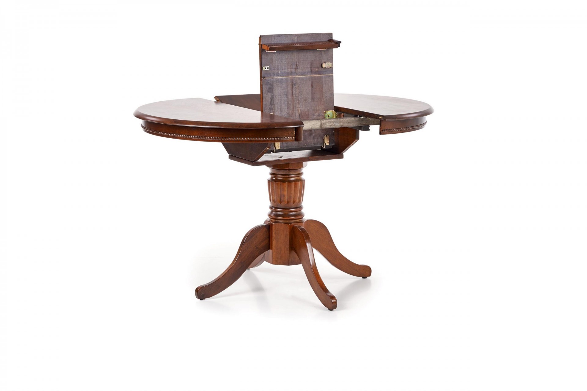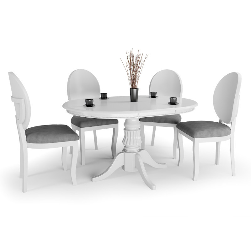 Klasszikus stílusú, kör alakú, bővíthető fafurnéros étkezőasztal tömörfa központi lábbal.