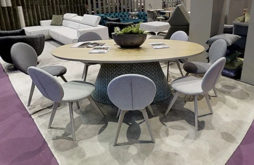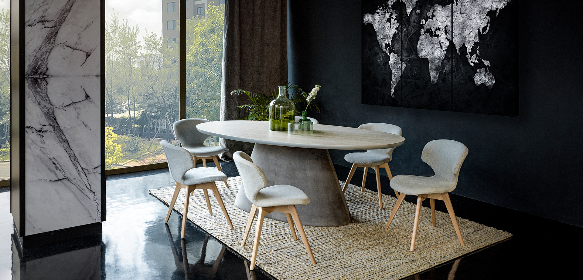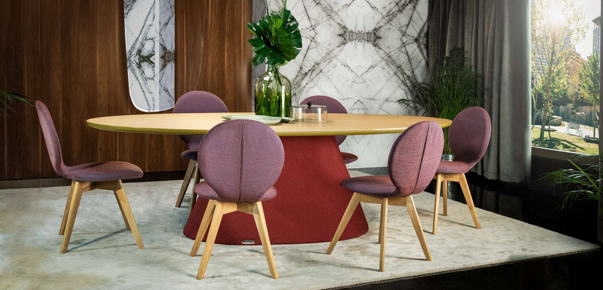 Prémium kategóriás, tölgyfa furnéros design étkezőasztal kárpitozott központi lábbal, széles szövetválasztási lehetőséggel. Az asztal többféle pác színnel kérhető, így a termék kiválóan illeszkedik bármilyen stílusú enteriőrhöz.