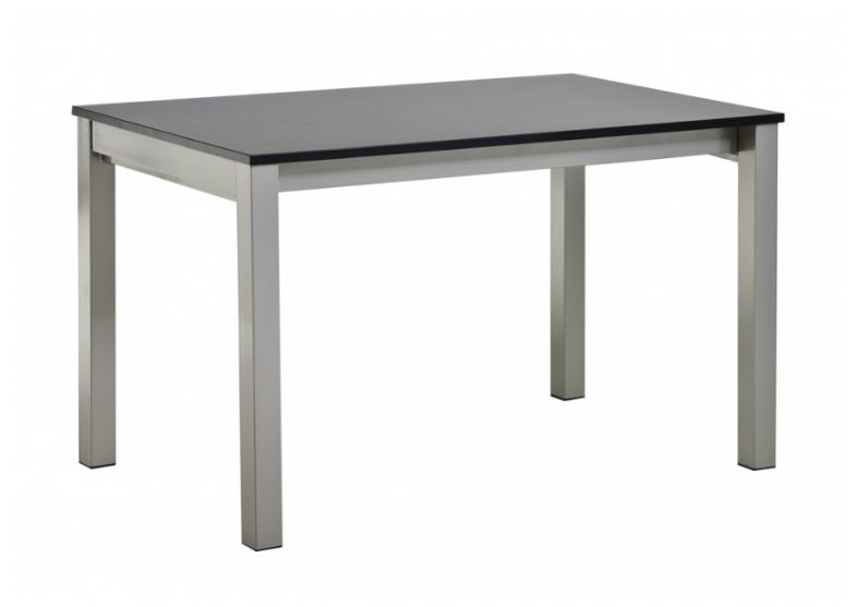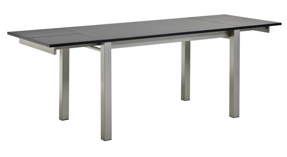 Modern, 2 db pótlappal bővíthető étkezőasztal többféle, nagy karc- és kopásállósággú HPL asztallap típussal, választható színű rozsdamentes acél lábazattal. Az asztal kétféle méretben is elérhető.