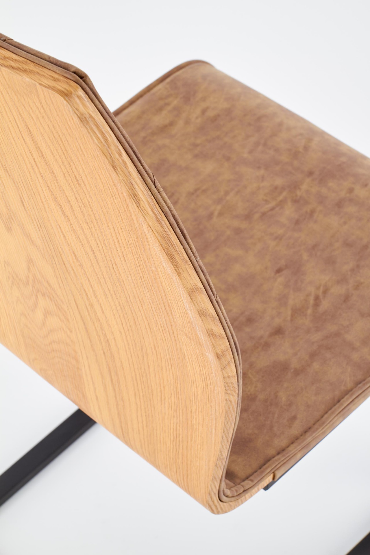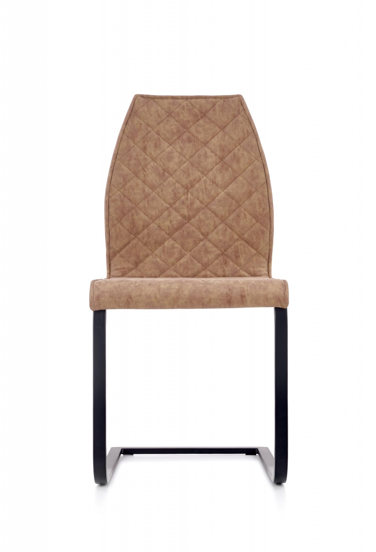 Modern szánkótalpas étkezőszék elegáns, steppelt háttámlával, poszórt acél lábazattal, puha textilbőr bevonattal.