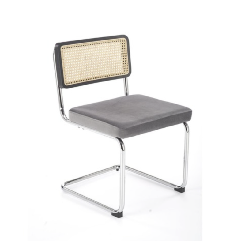 Kényelmes rattan háttámlás, bársony borítású, szánkótalpas étkezőszék.
