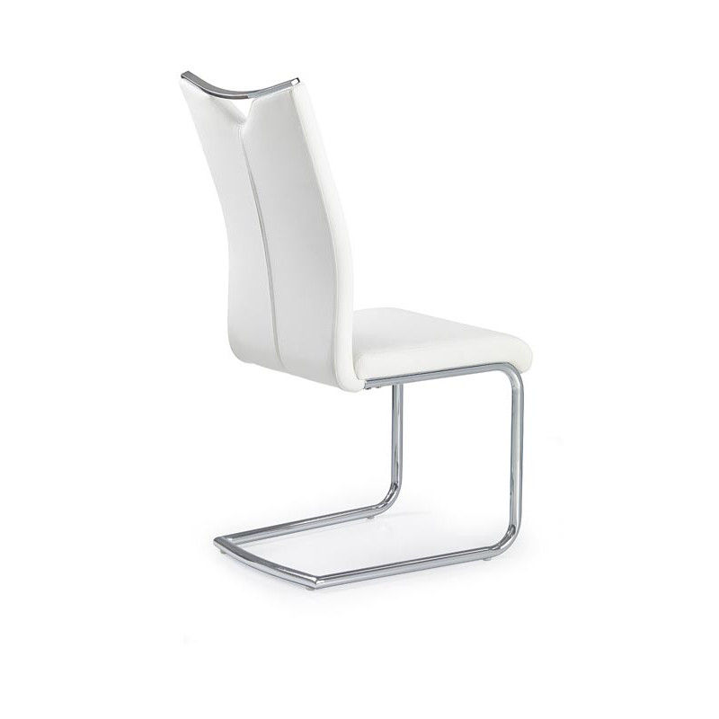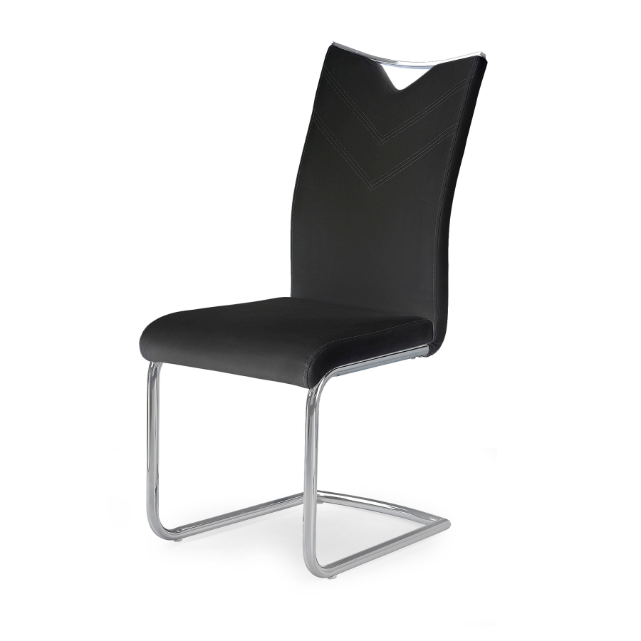 Krómacél vázzal rendelkező, textilbőr kárpittal borított szánkótalpas étkezőszék praktikus fogantyúval.