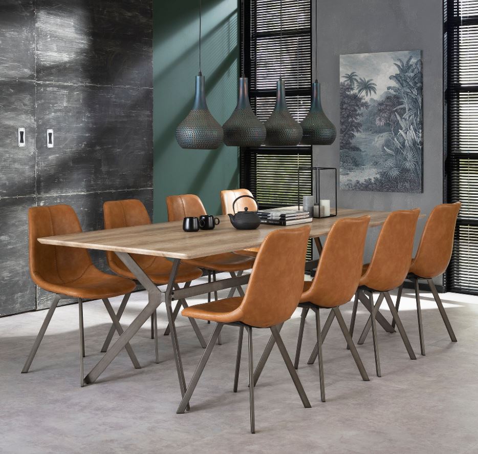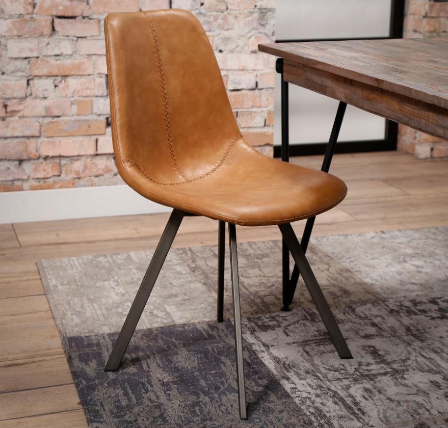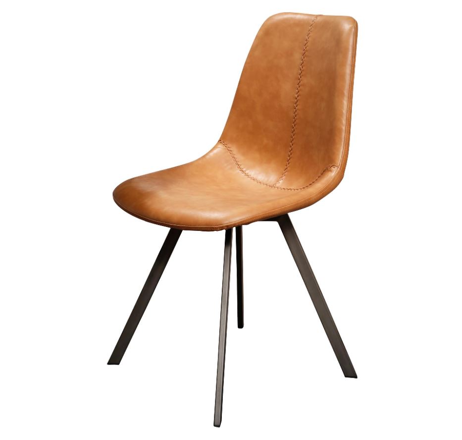Modern étkezőszék acél vázzal, nagy kopásállóságú bőrhatású kárpitozással.