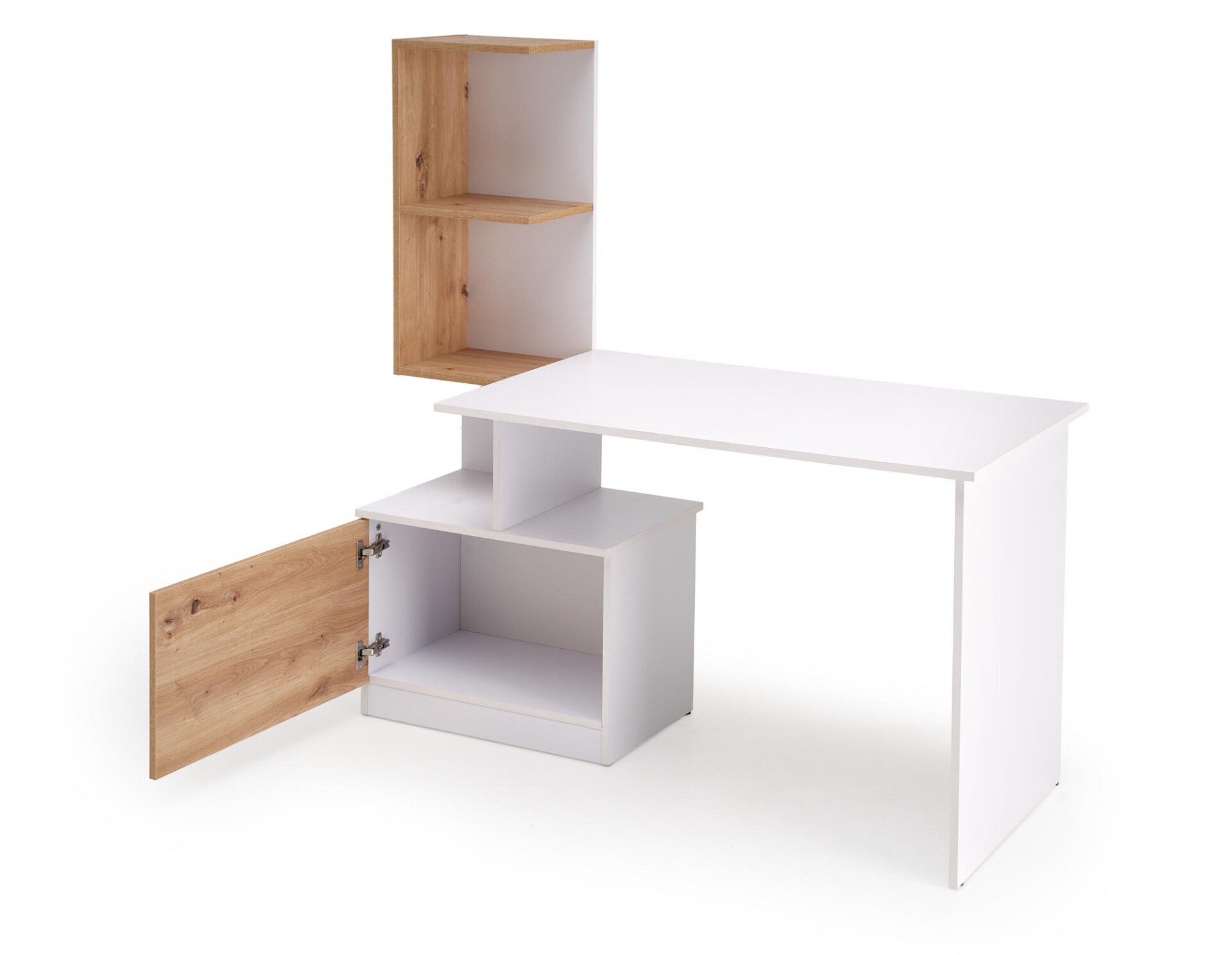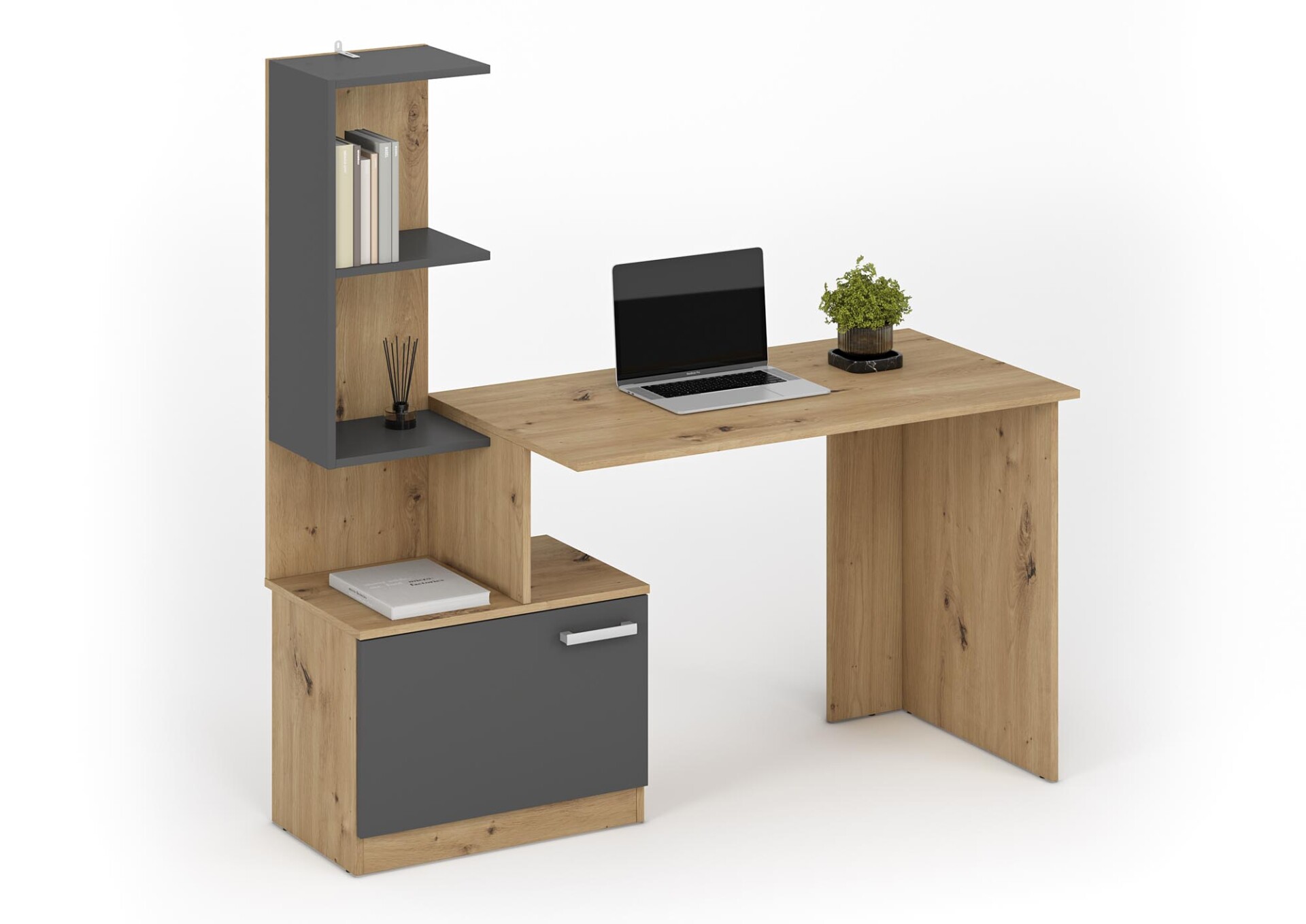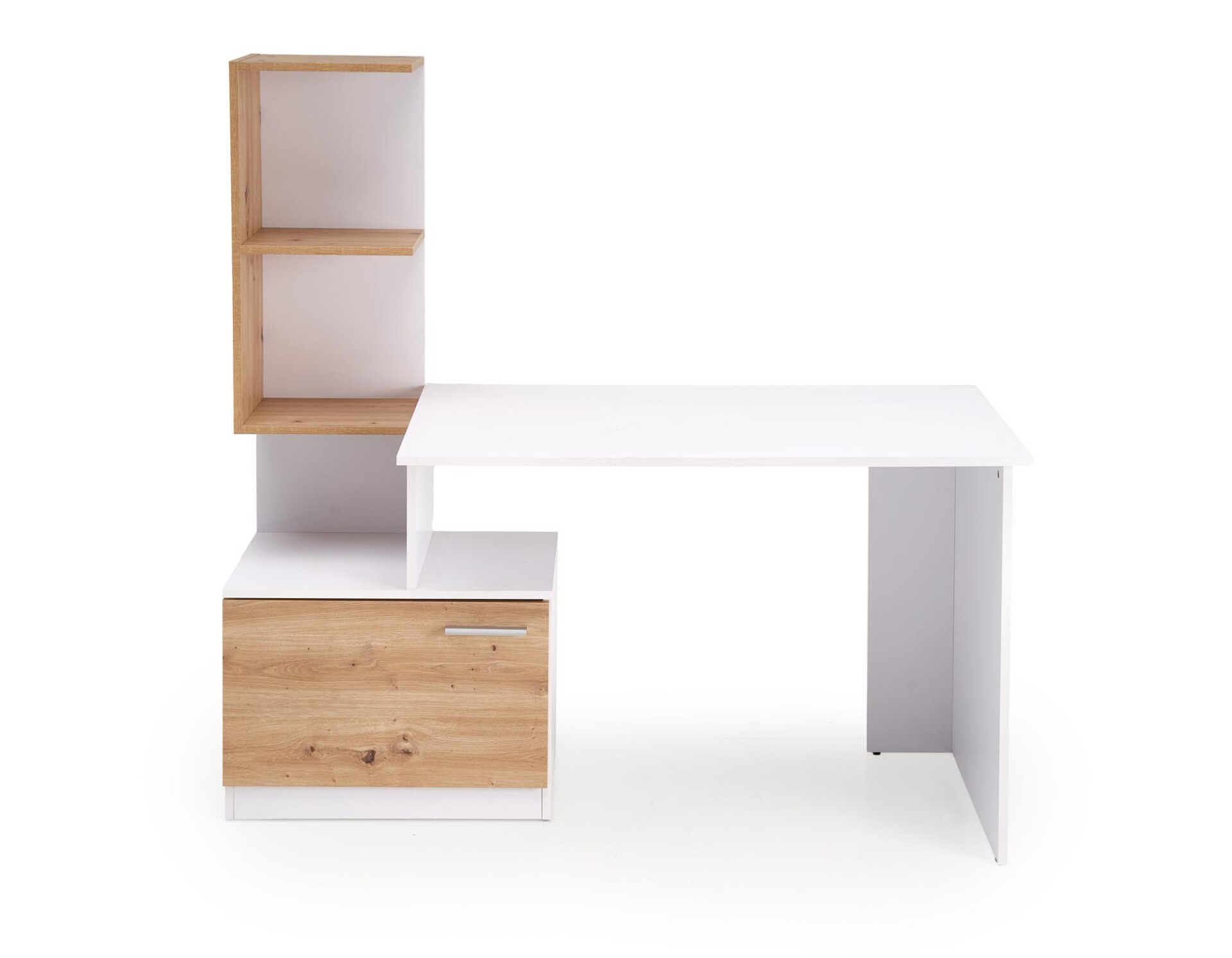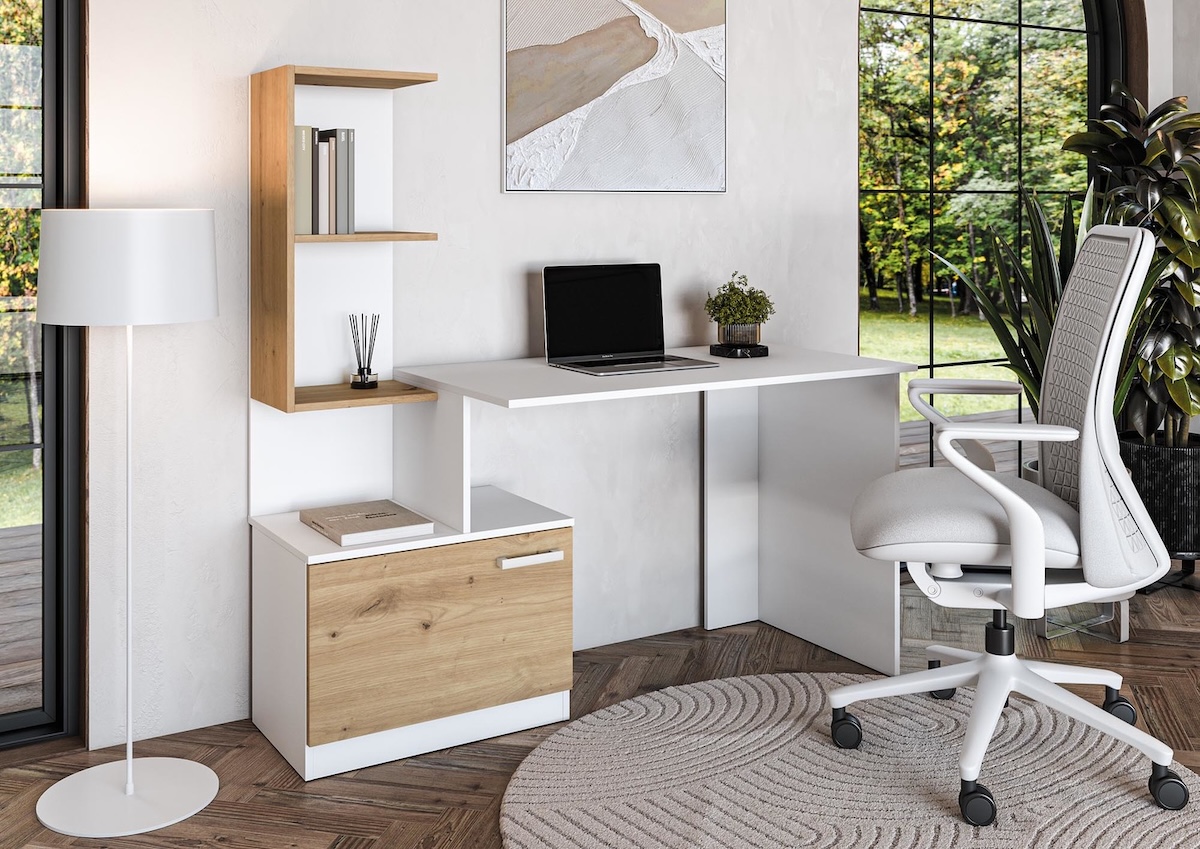 Praktikus íróasztal polcokkal, zárt és nyitott tárolóval.
