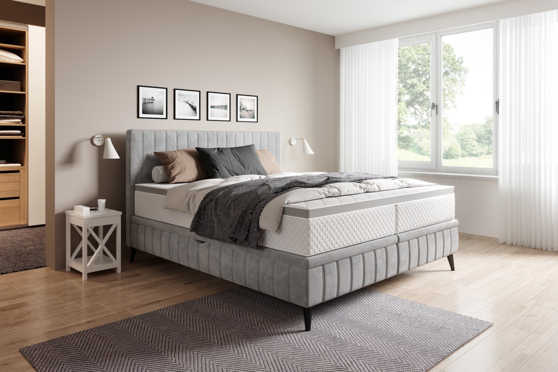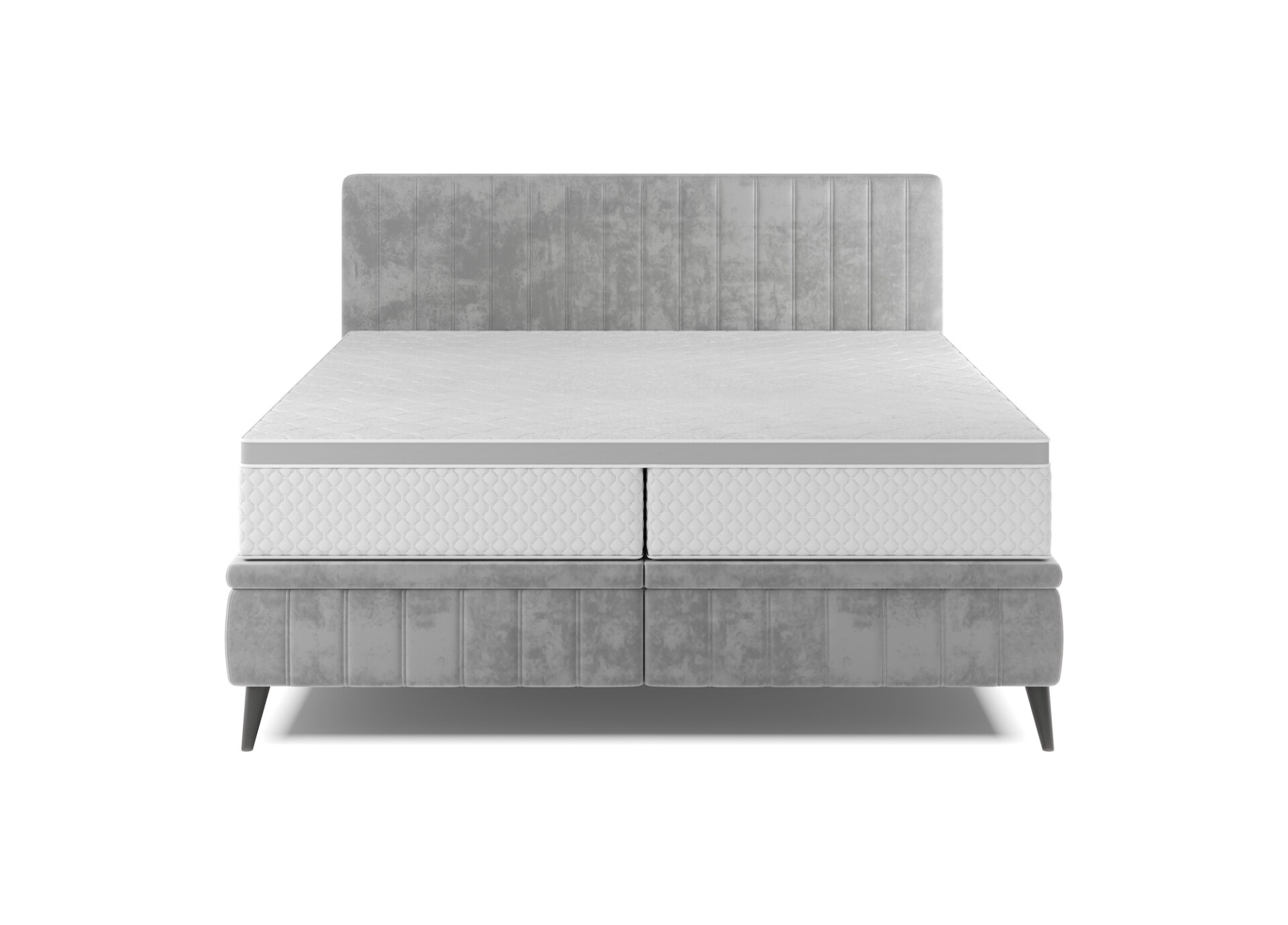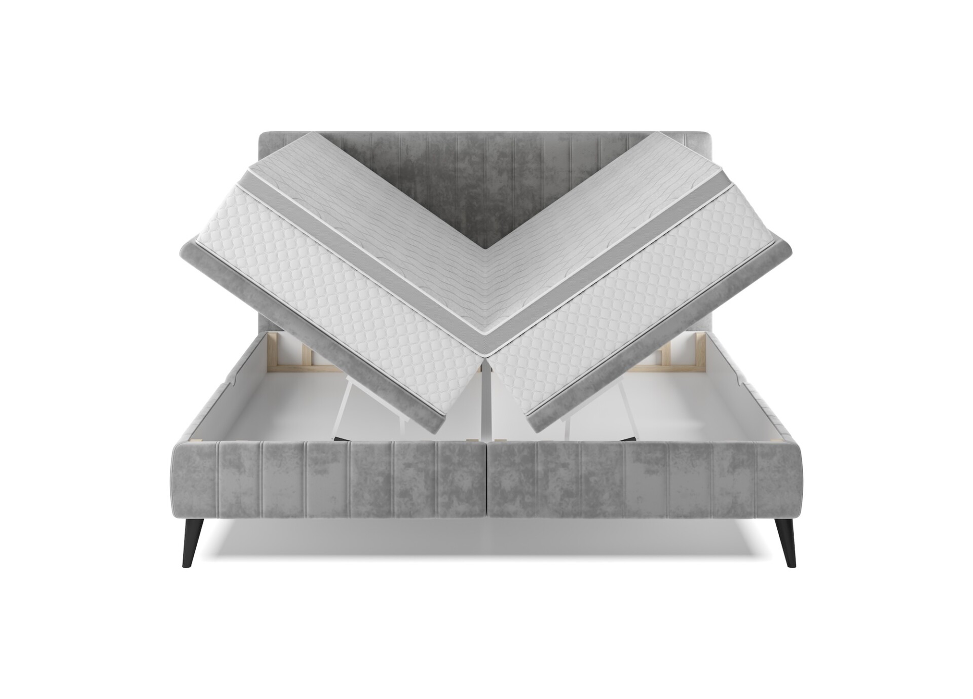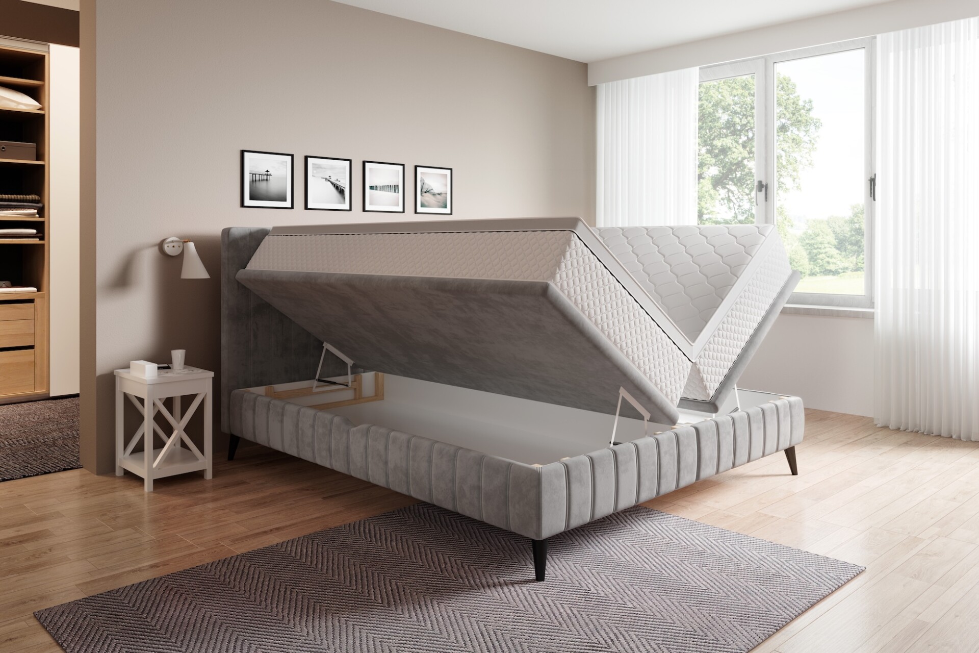 Stílusos megjelenésű franciaágy tűzött fejvéggel, magas lábakon, 2 oldalról nyitható ágyneműtartóval.