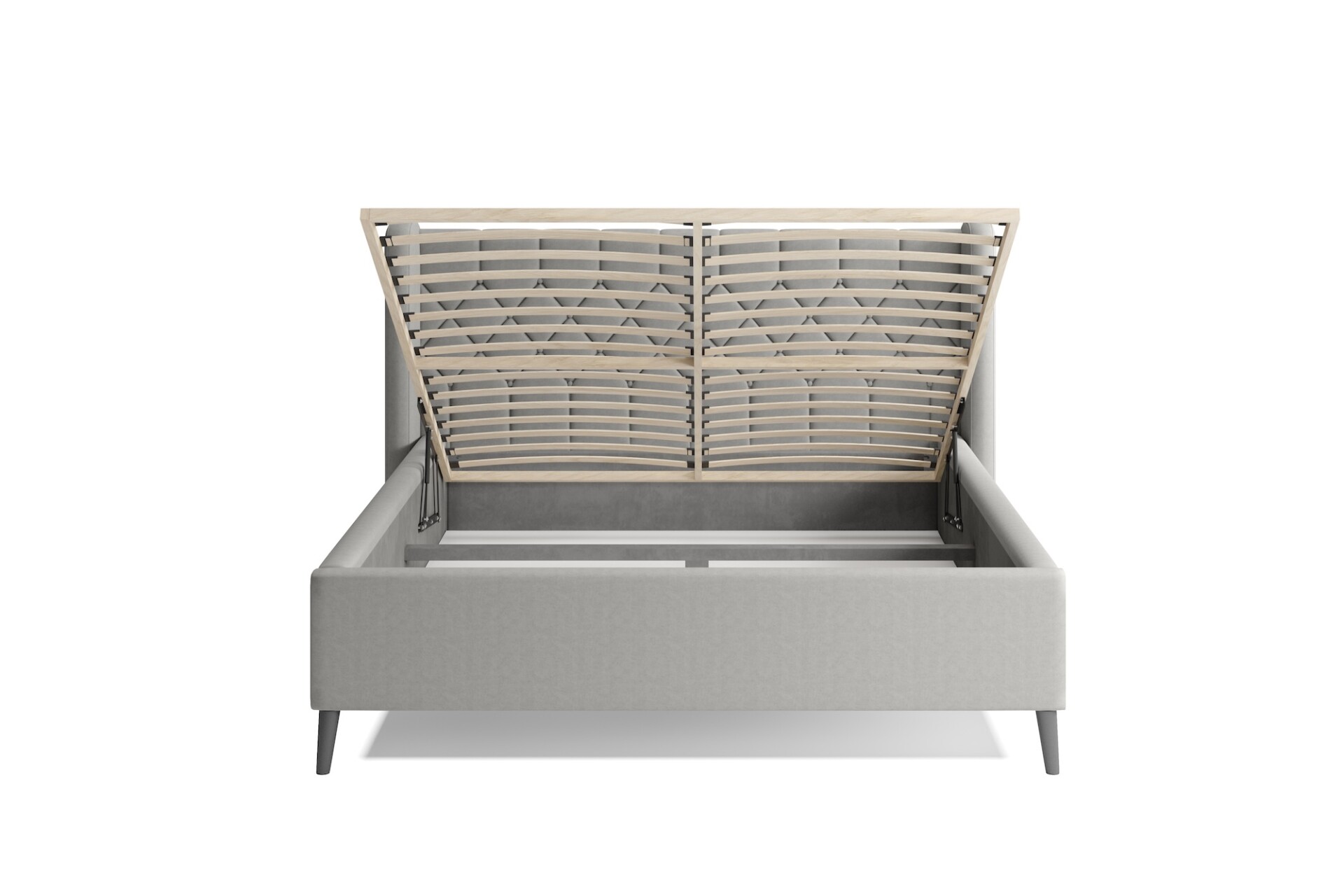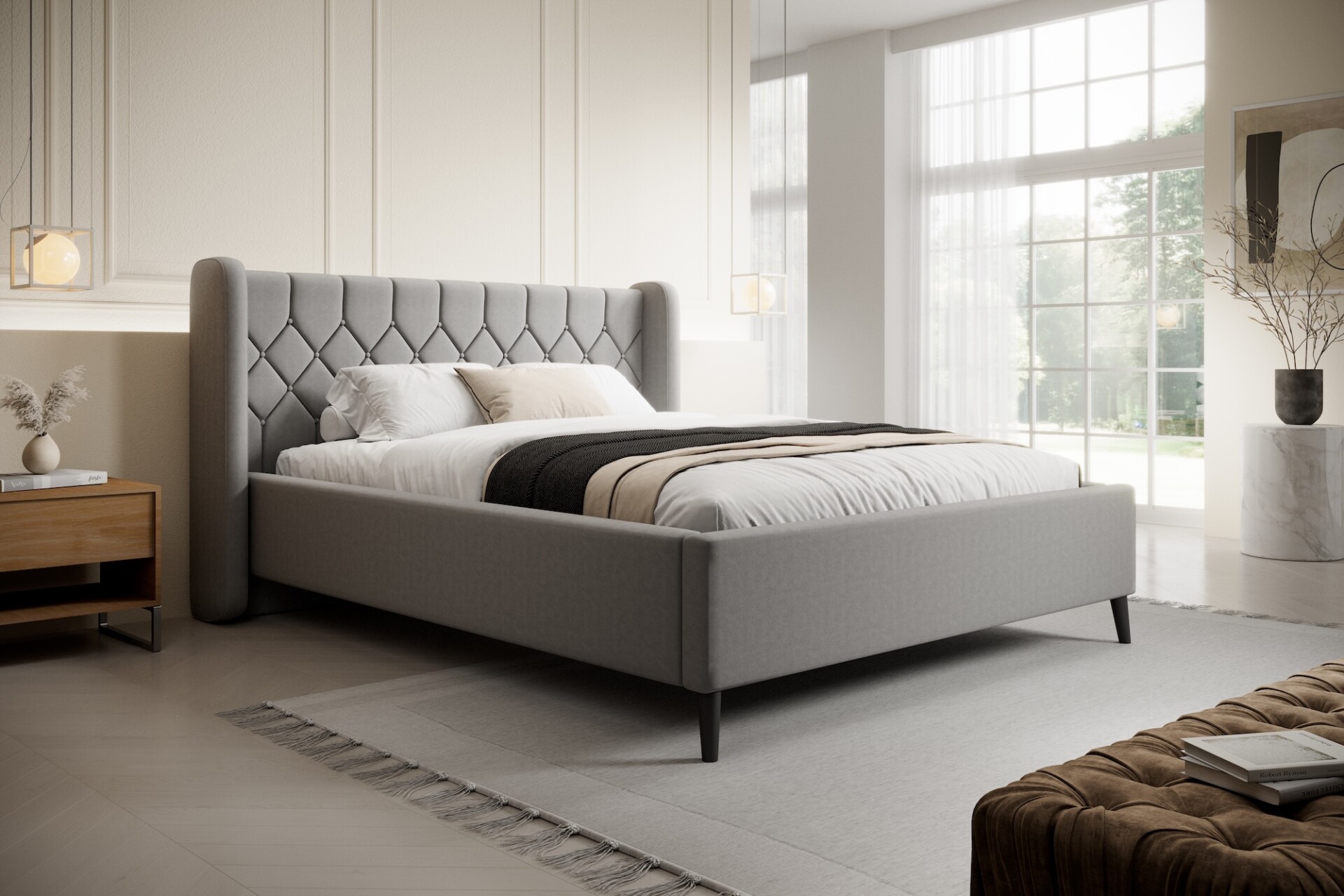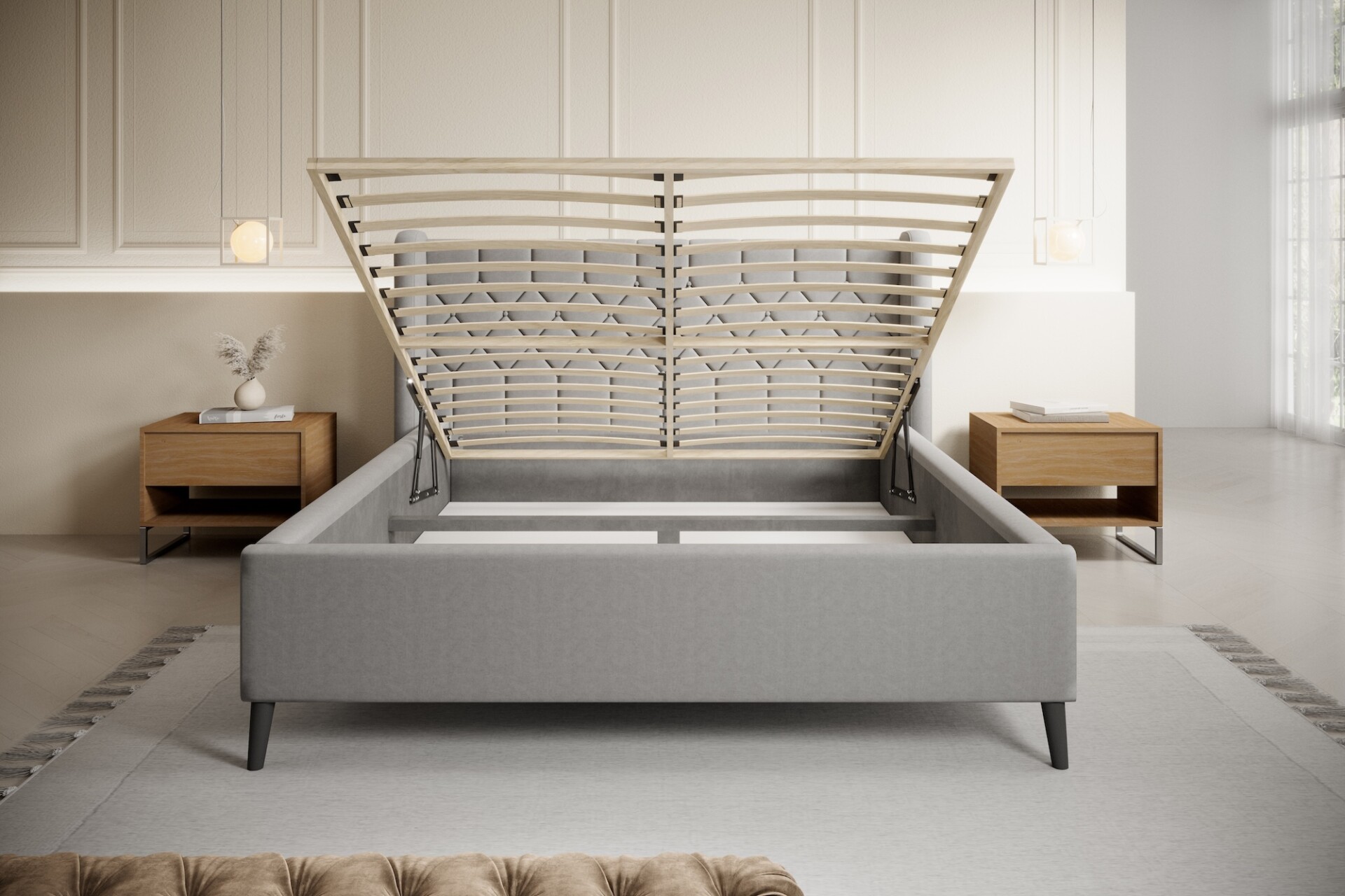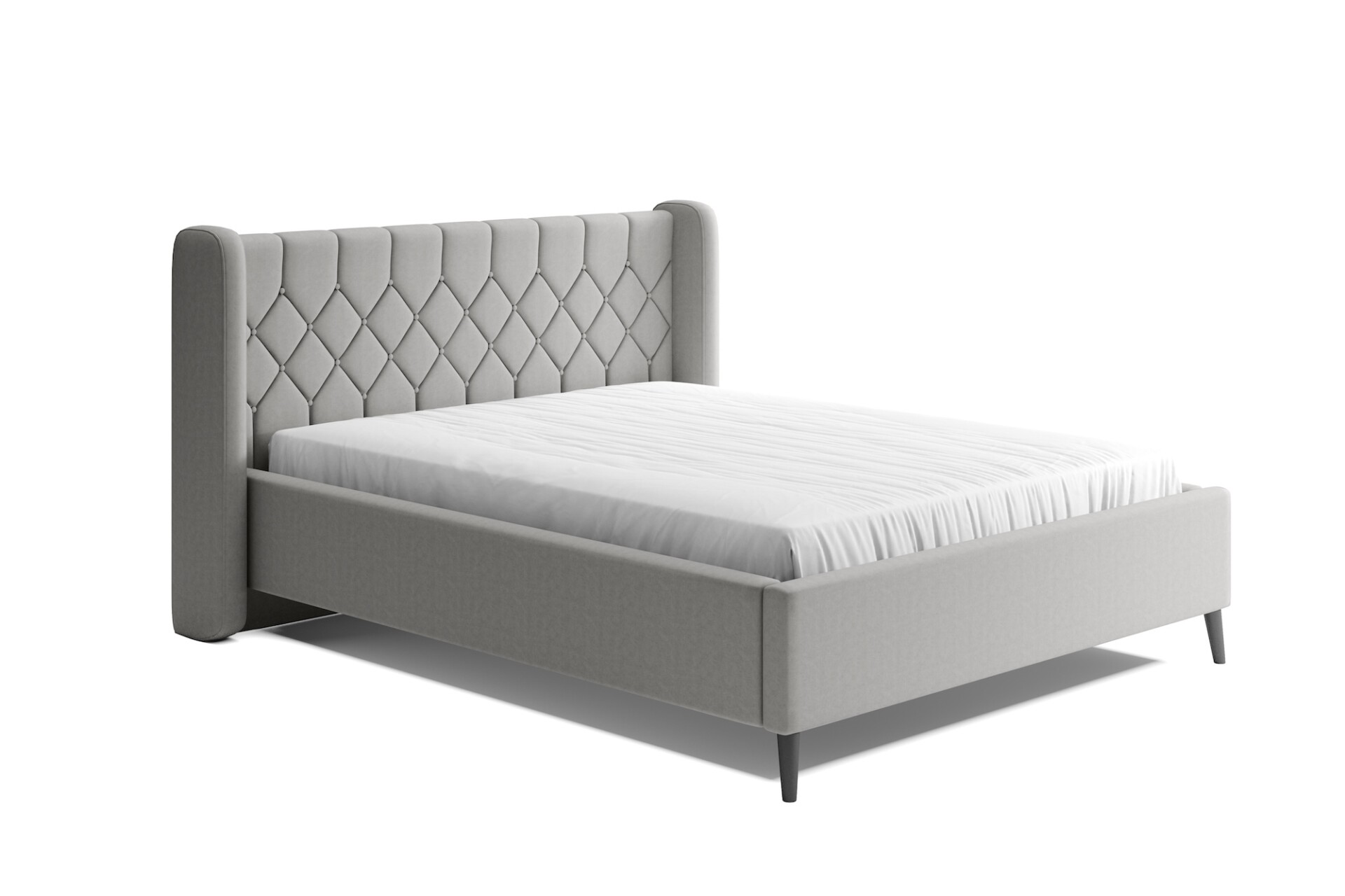 Stílusos megjelenésű franciaágy tűzött fejvéggel, ágyneműtartóval, magas lábakon.