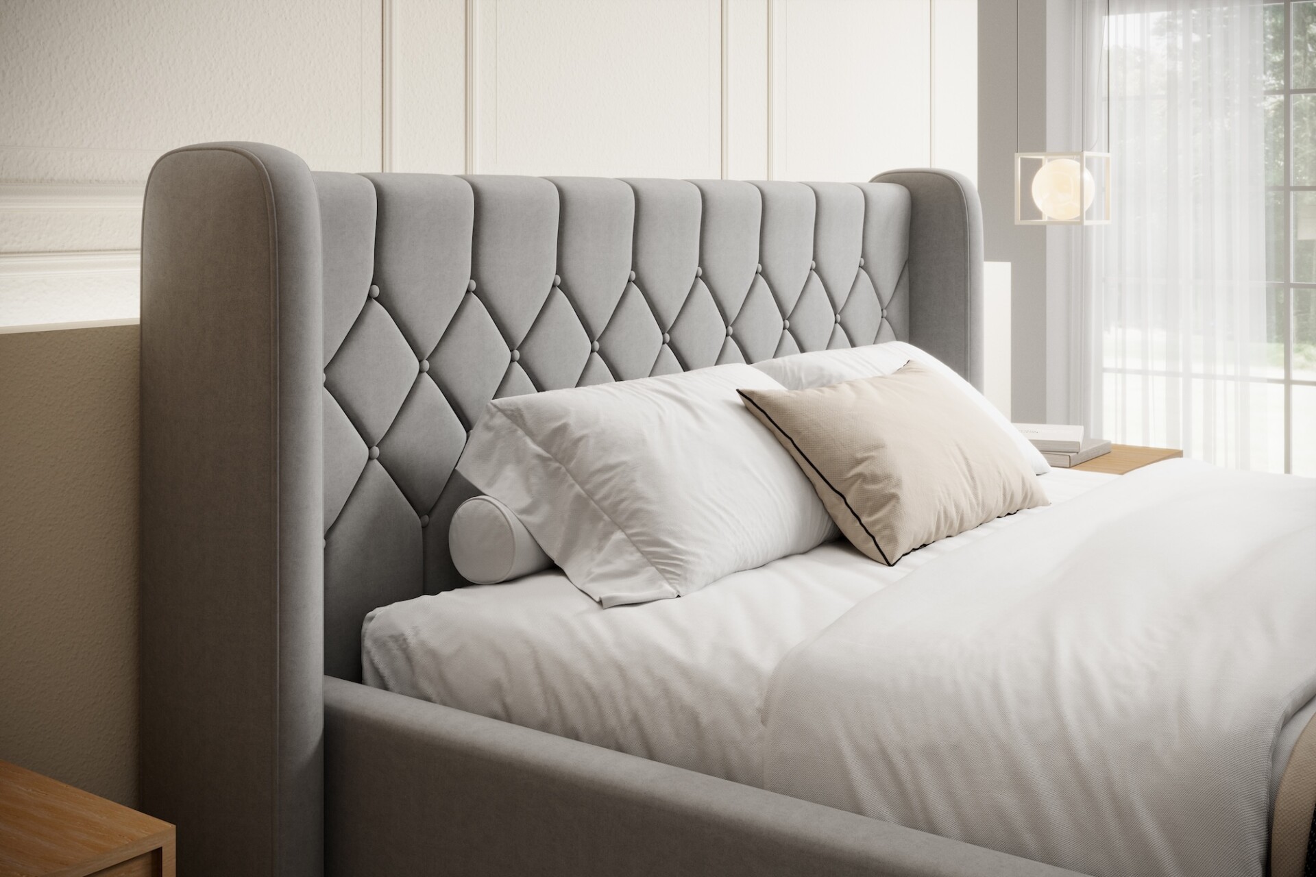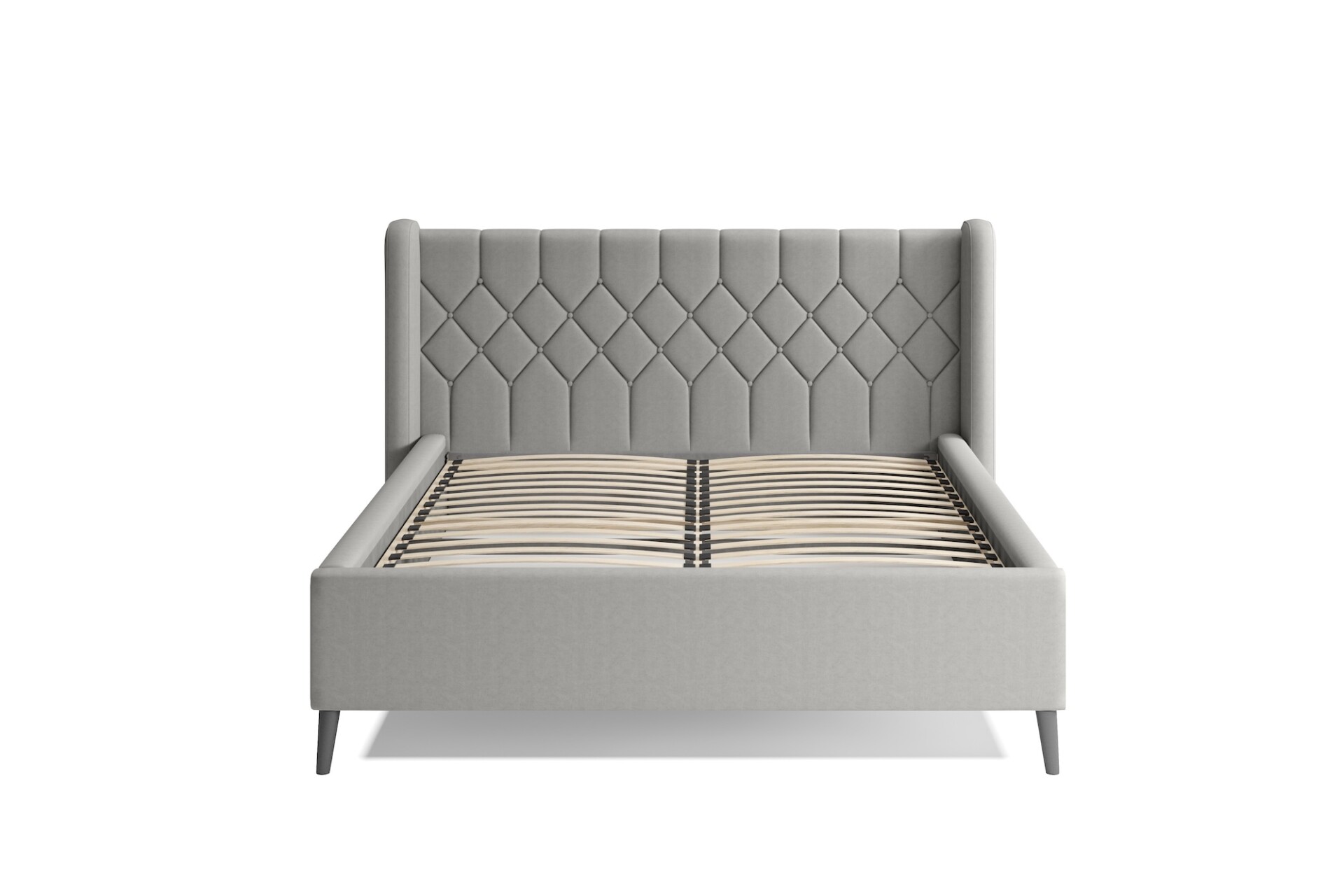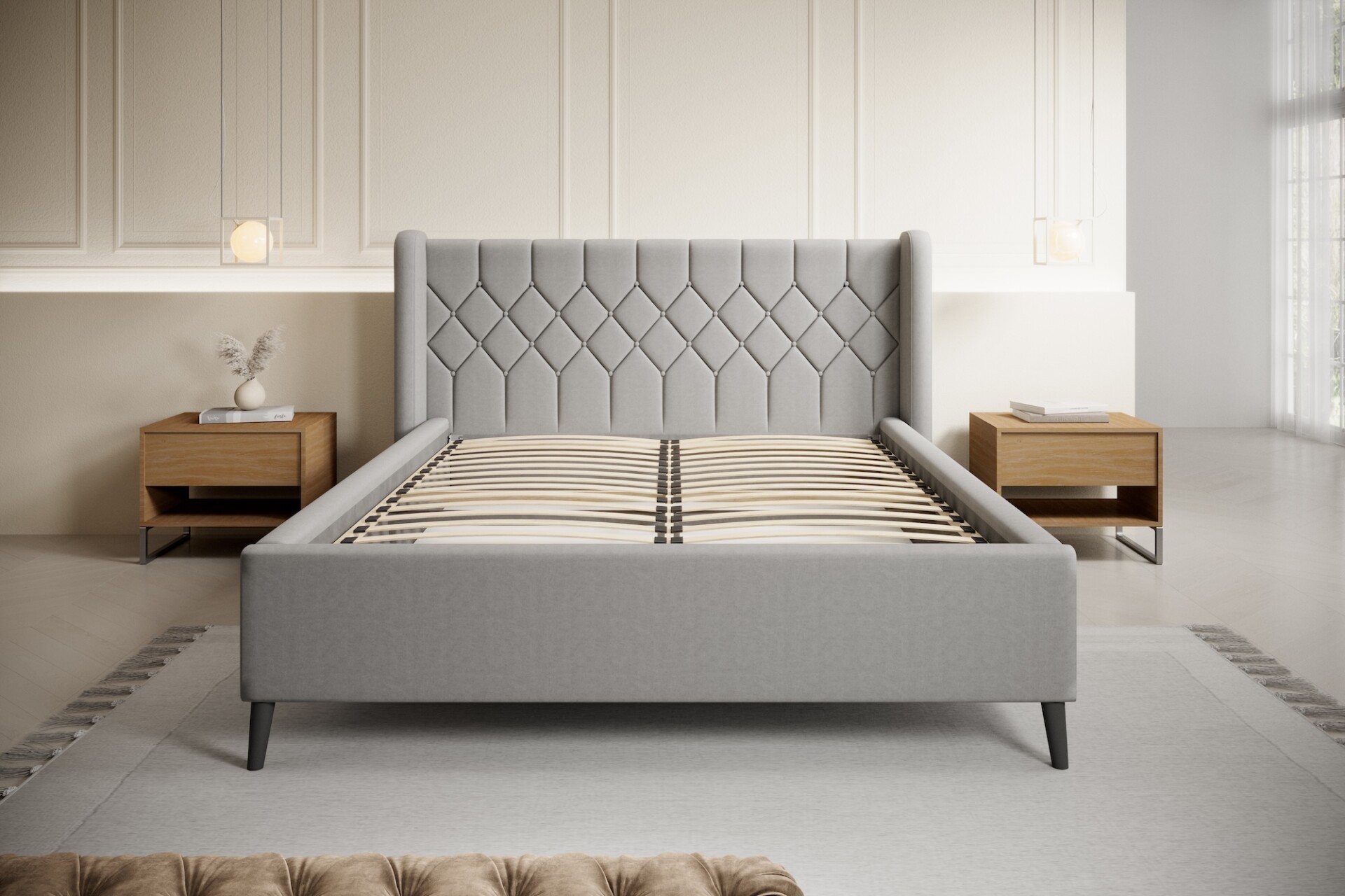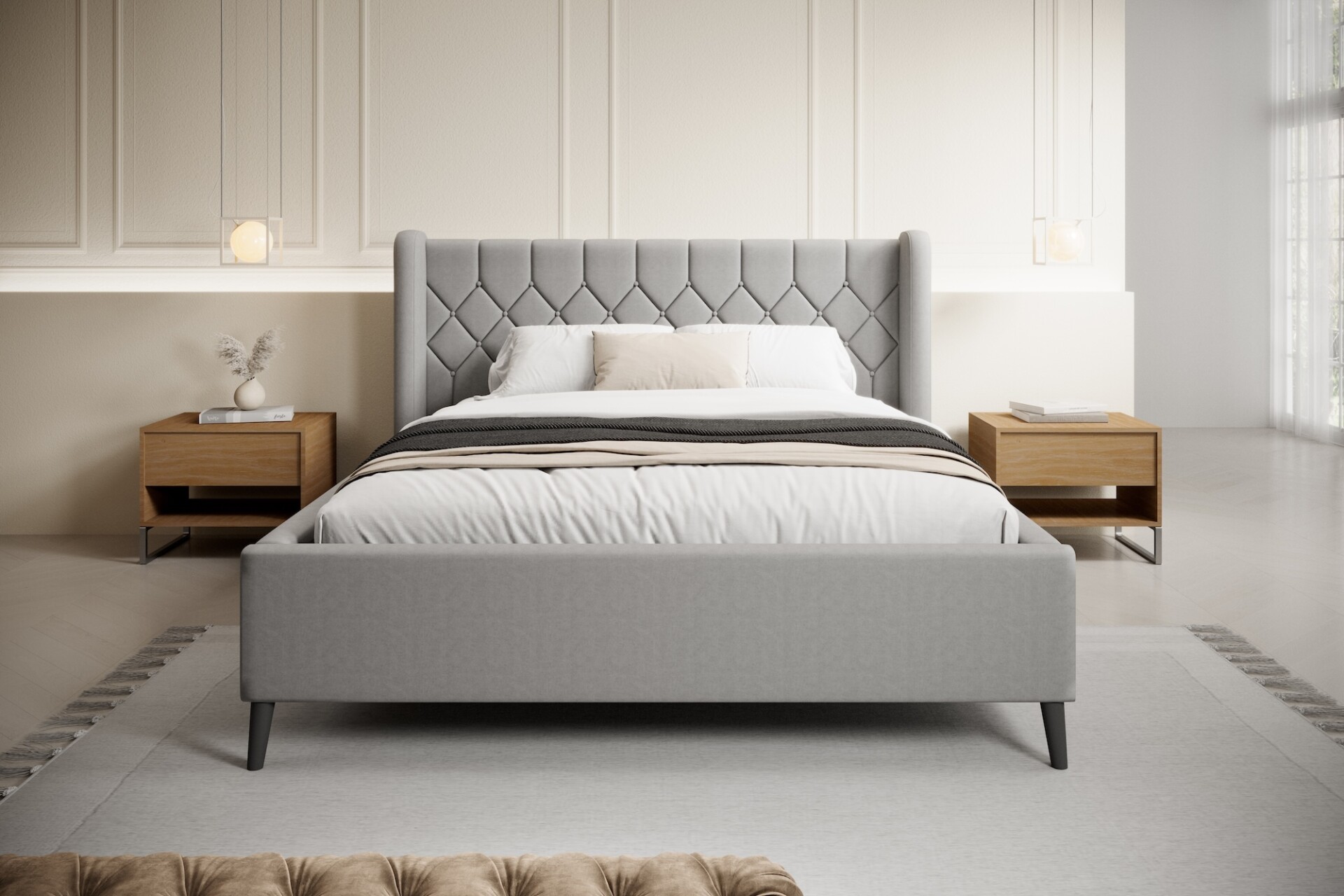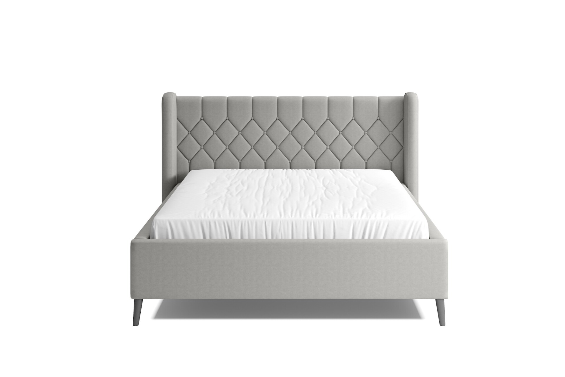Stílusos megjelenésű franciaágy tűzött fejvéggel, ágyneműtartóval, magas lábakon.