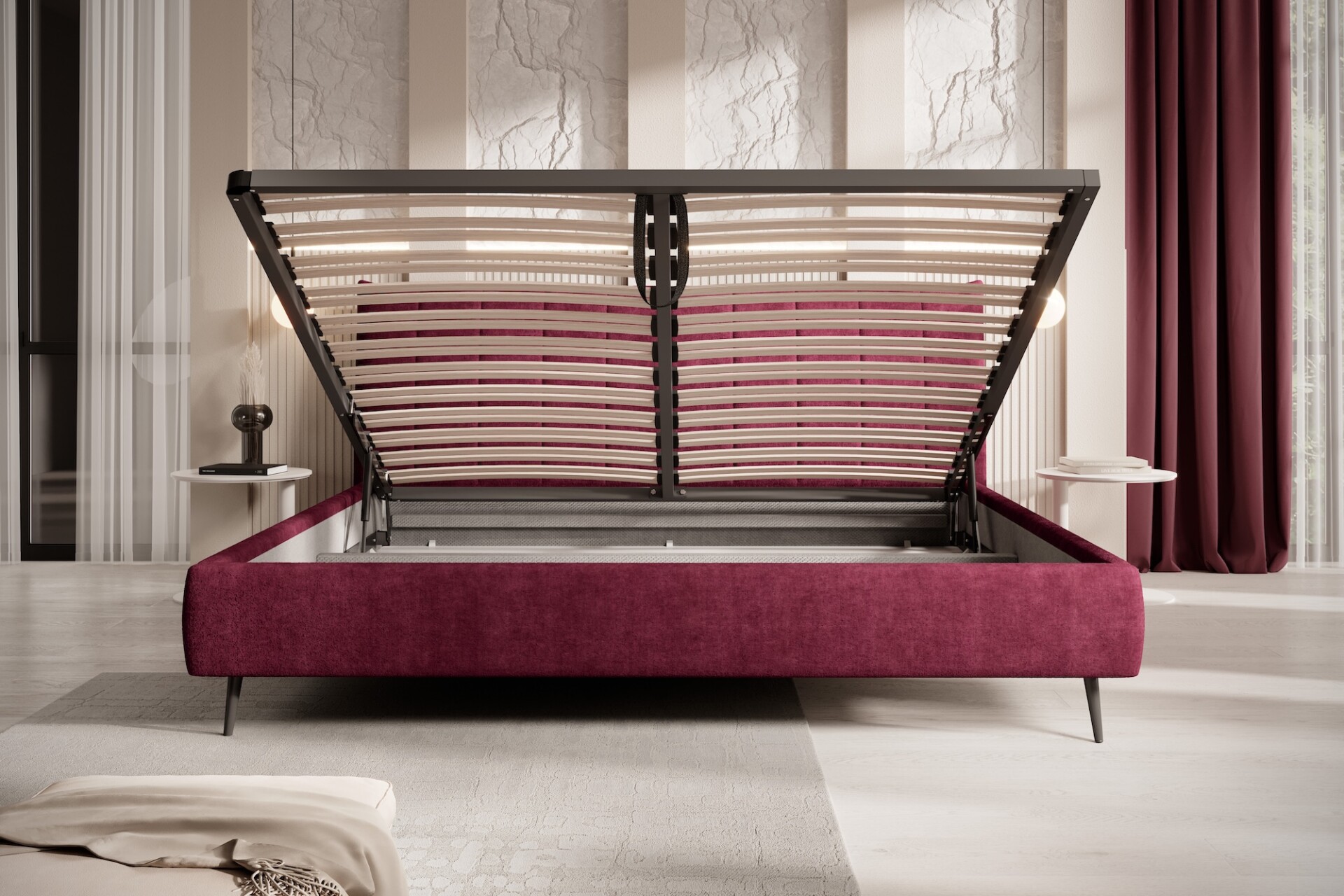 Stílusos megjelenésű franciaágy ágyneműtartóval, magas lábakon.