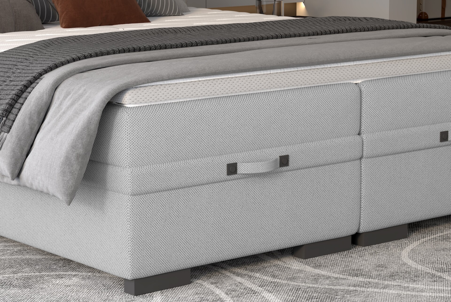 A Semeno boxspring franciaágy elegáns megjelenése mellett kimagasló kényelmet kínál – dupla matracrendszerének köszönhetően tökéletes alátámasztást és pihentető alvásélményt biztosít minden este.