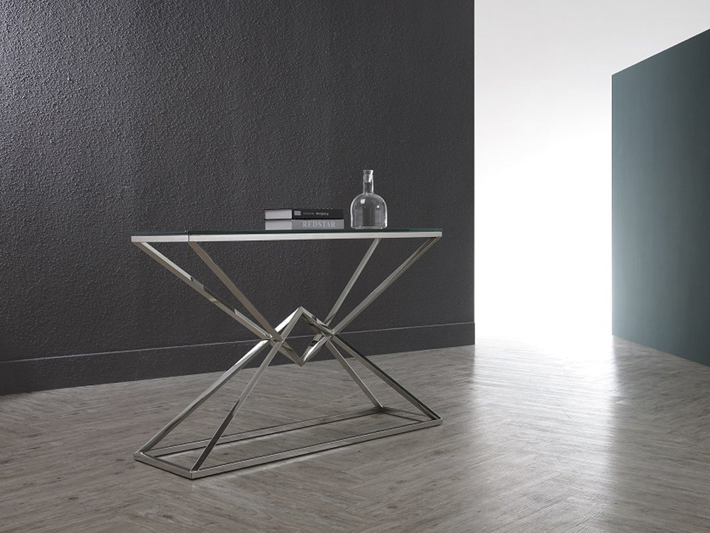 Elegáns, modern konzolasztal csiszolt rozsdamentes acélból, mely tökéletes kiegészítője lehet otthonának.