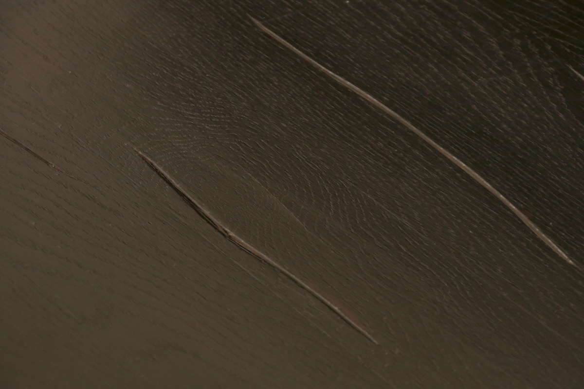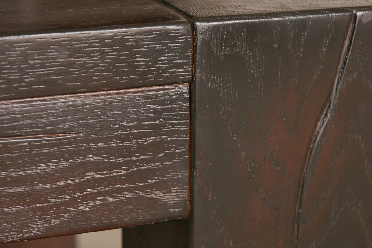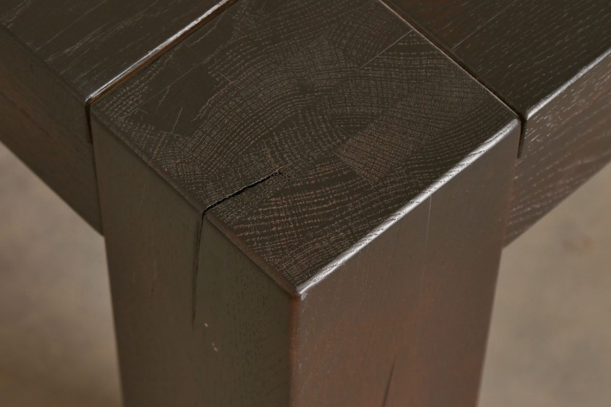 Asztallap anyaga: rusztikus jellegű tömör tölgyfa (természetes repedésekkel, görcsökkel).