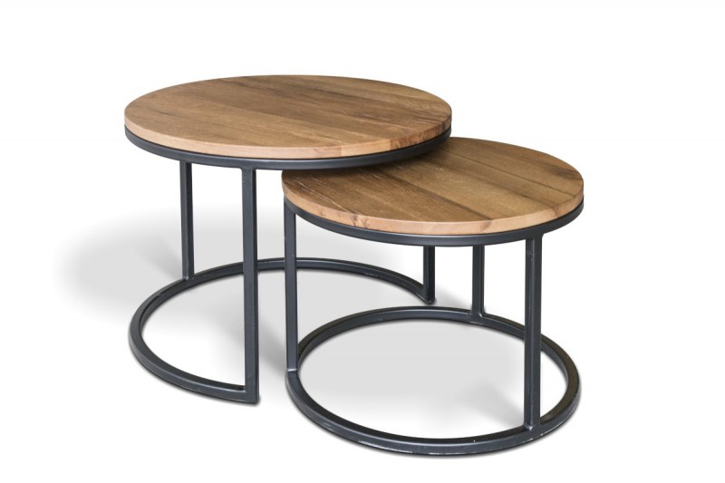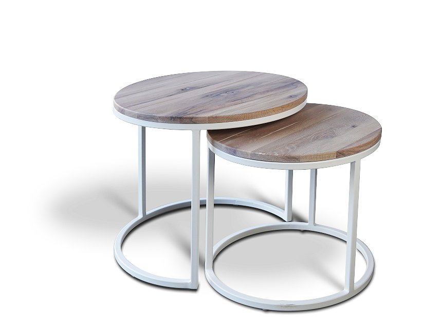 Letisztult megjelenésű, tömör tölgyfa dohányzóasztal nemesacél lábazattal.
