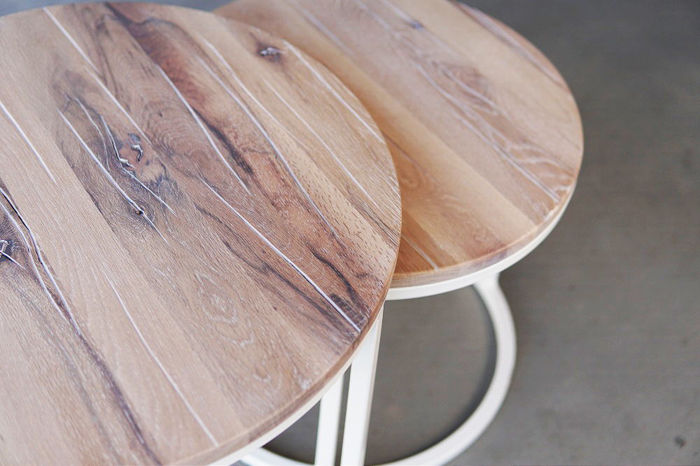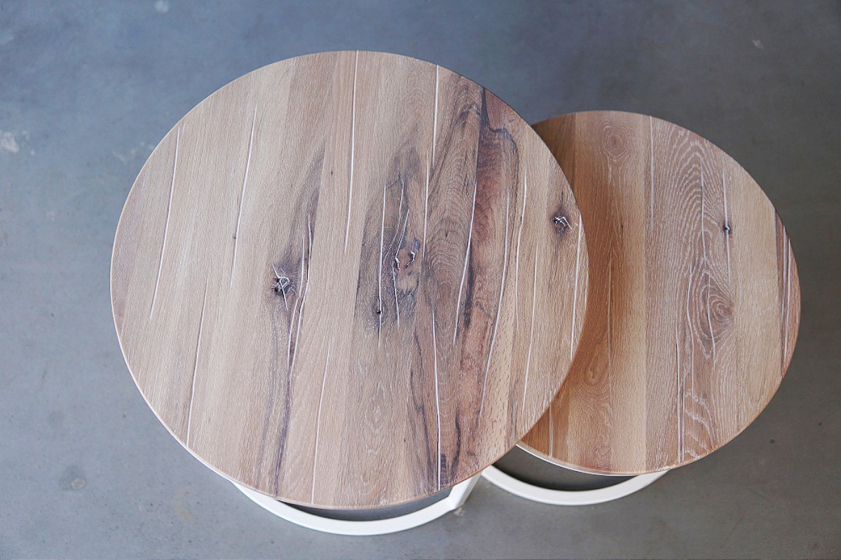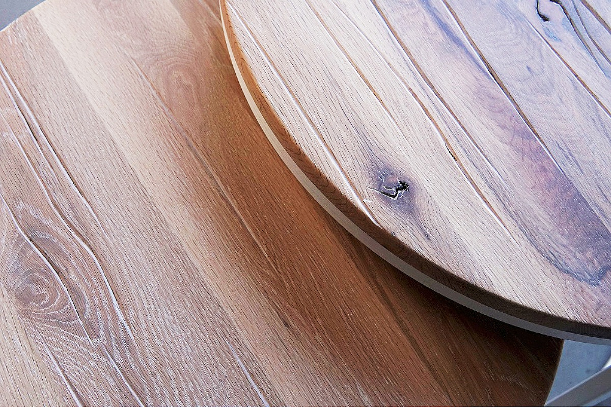 Asztallap anyaga: rusztikus jellegű tömör tölgyfa (természetes repedésekkel, görcsökkel)