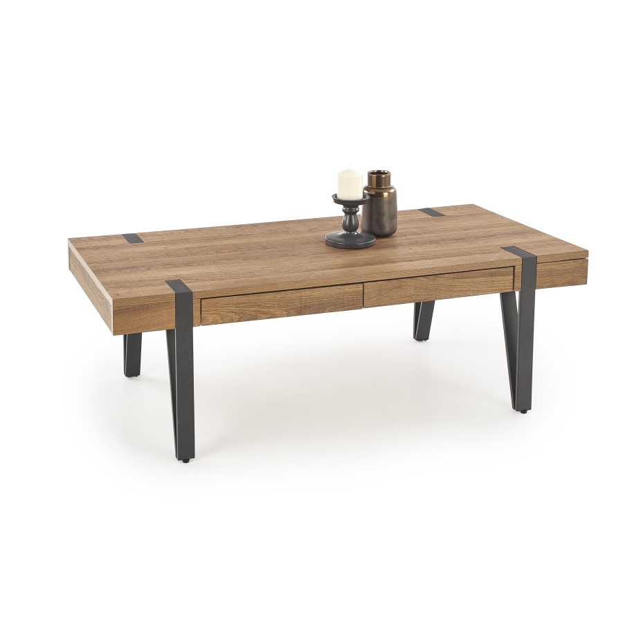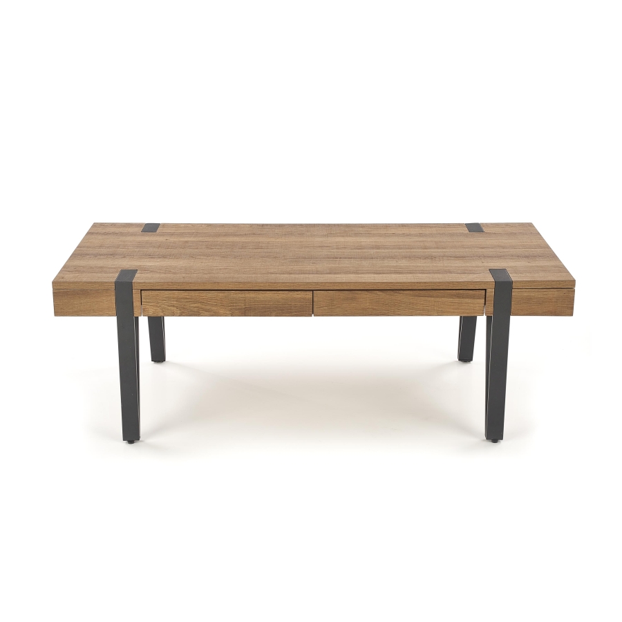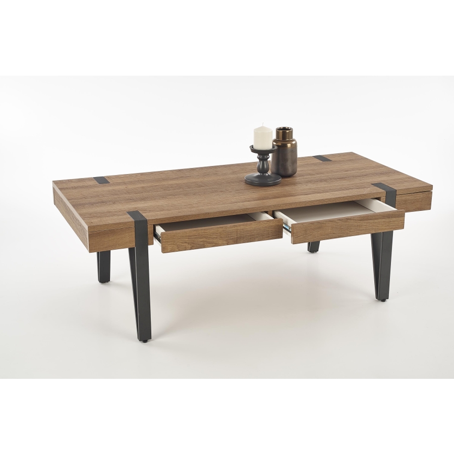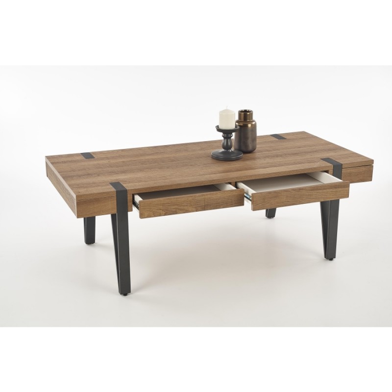 Modern dohányzóasztal dupla fiókkal, porszórt acél lábbal, dió színű asztallappal.