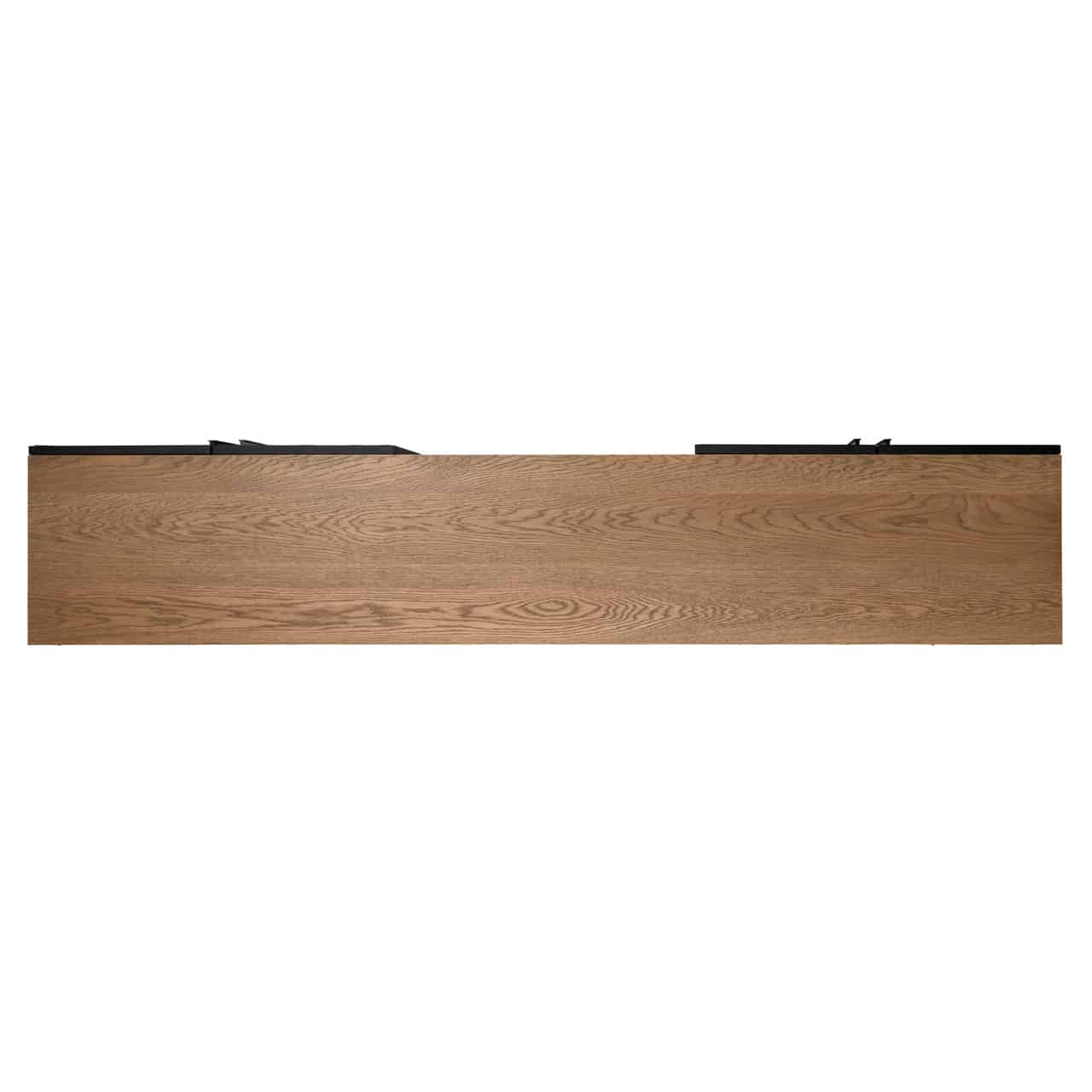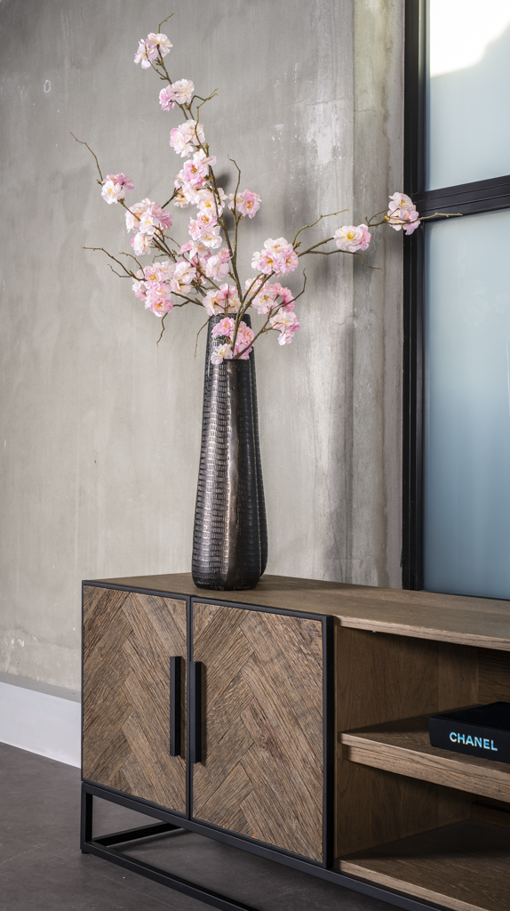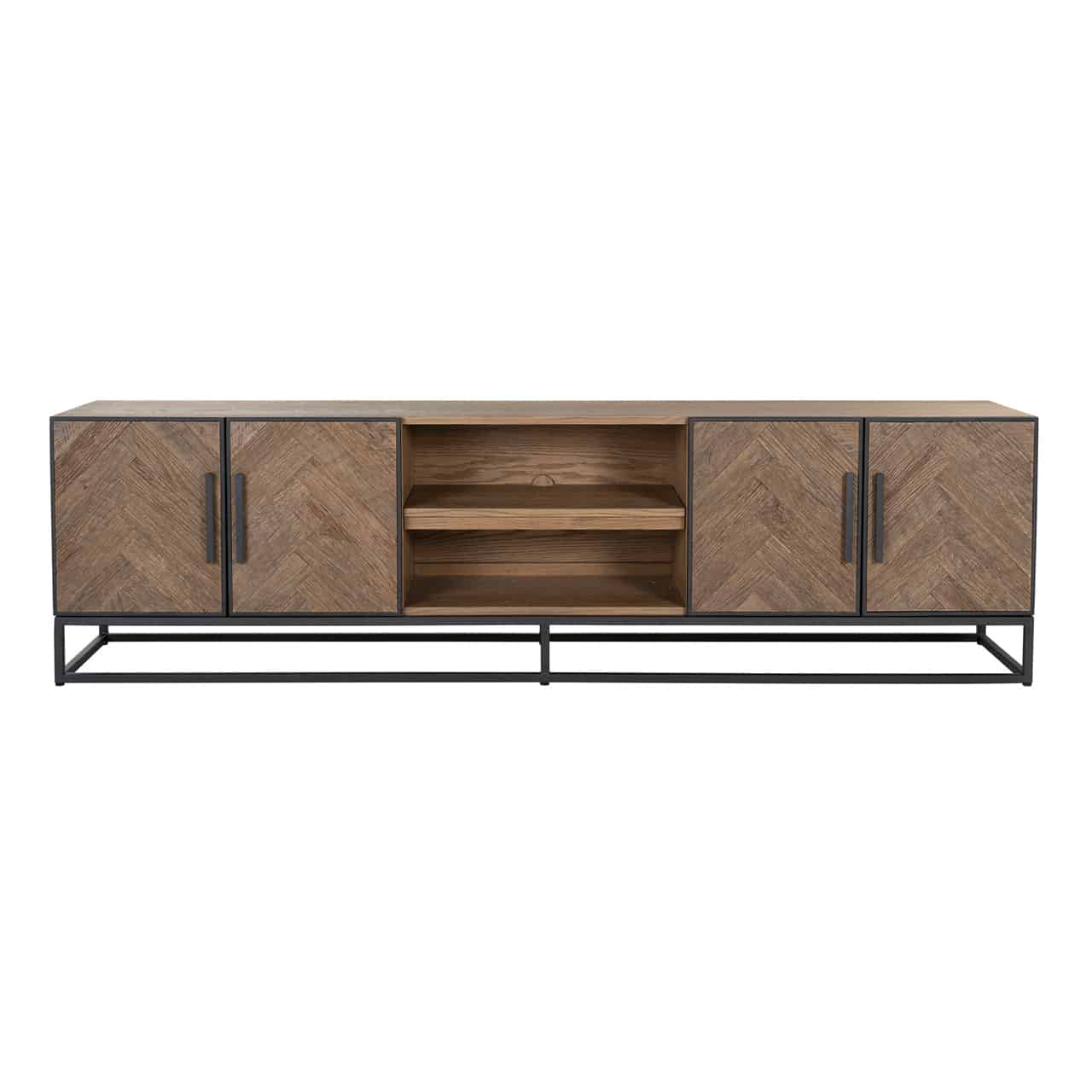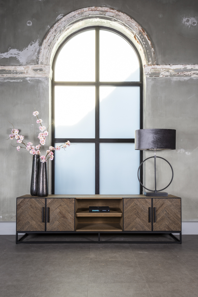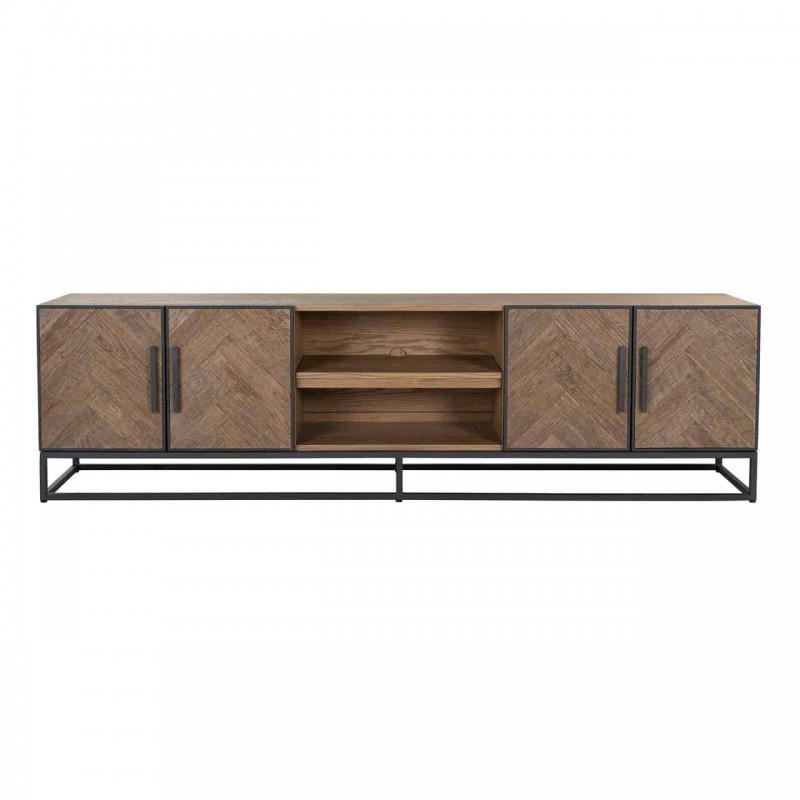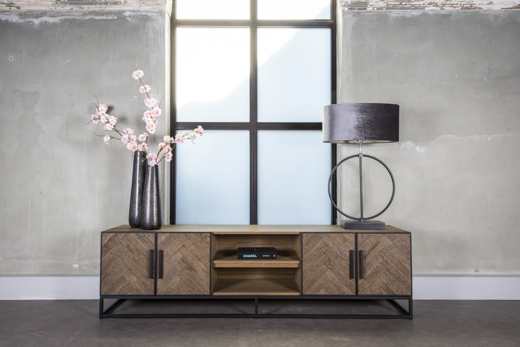 Indusztriális stílusú TV szekrény halszálka mintázatú fa lappal, elegáns, feketére festett lábakkal.