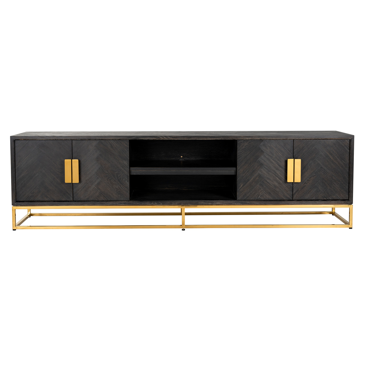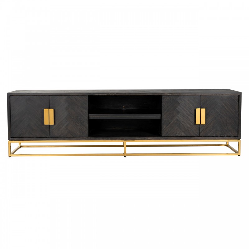 Elegáns TV állvány aranyszínű kerettel, fekete színűre pácolt, halszálka mintázatú tölgyfa lappal.