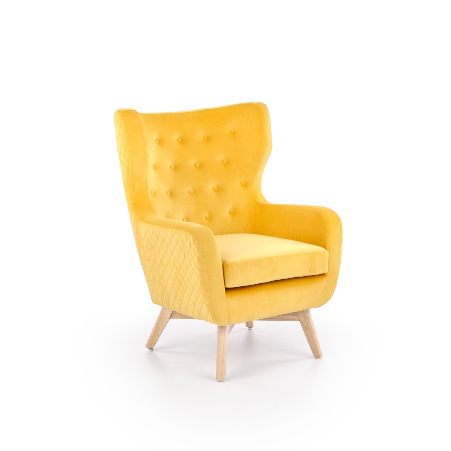 Kényelmes fotel trendi velvet szövet bevonattal, fekete színű tömör bükkfa lábakkal. A fotel oldalsó és hátsó része elegáns, steppelt kialakítást kapott.
