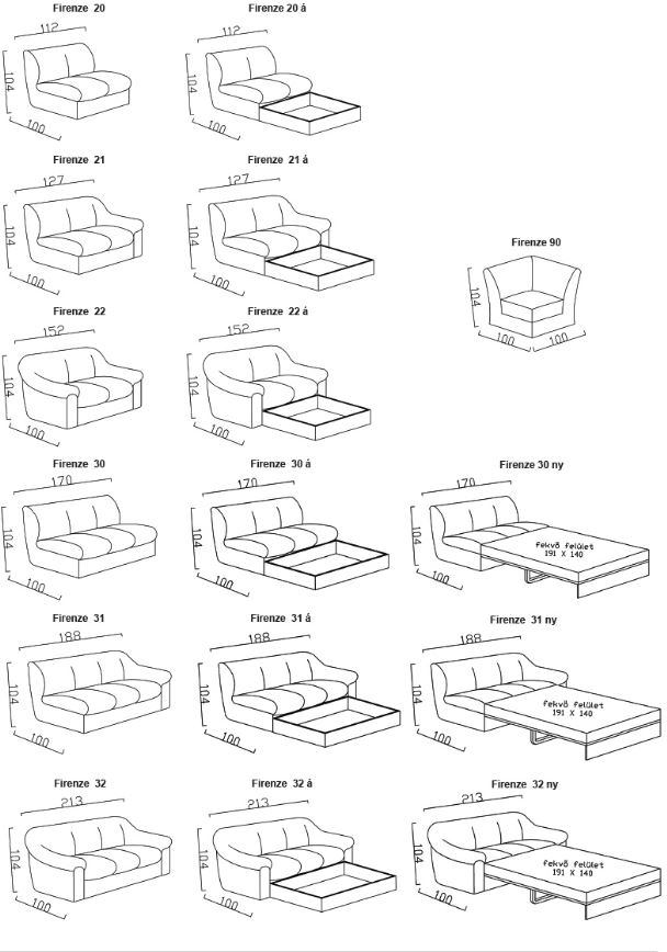 – 3 üléses kanapé: 213 x 104 x 100 cm, vendégágy fekvőfelület méret 191 x 140cm