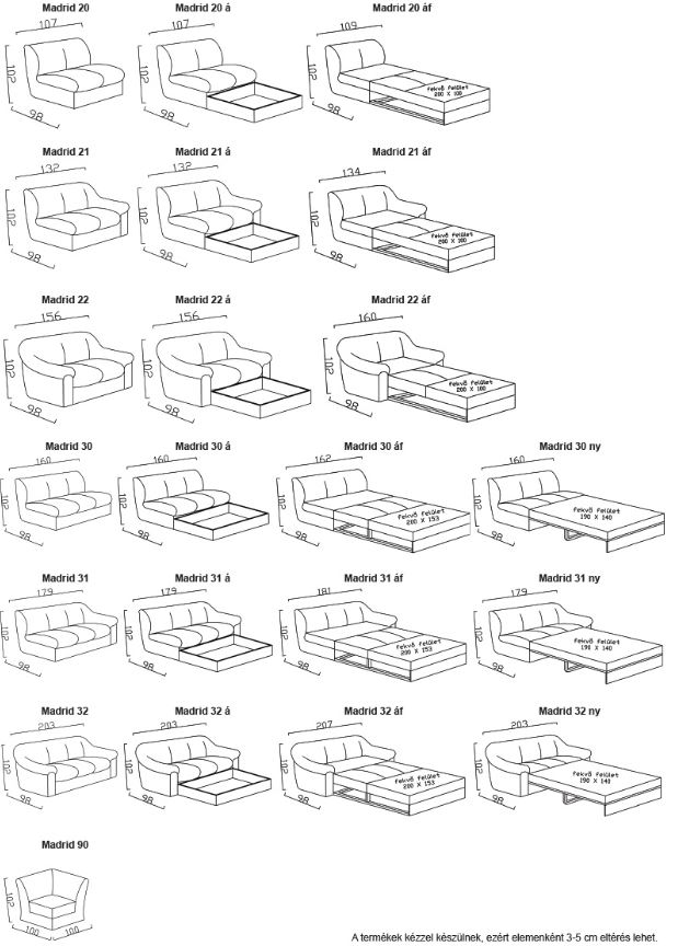 – 3 üléses kanapé: 207 x 102 x 98cm, vendégágy fekvőfelület méret 200 x 153cm, vagy 190 x 140cm