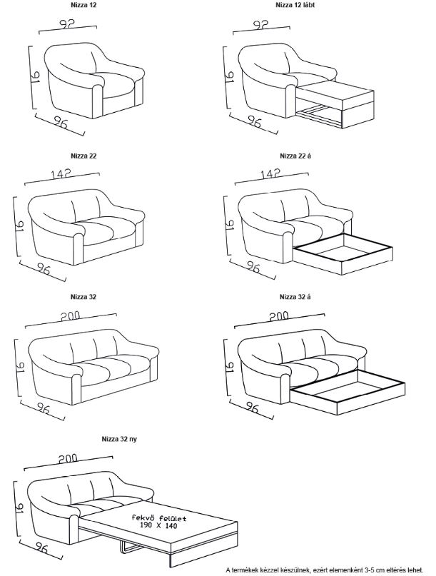 – 3 üléses kanapé: 200 x 91 x 96cm, vendégágy fekvőfelület méret 190 x 140cm