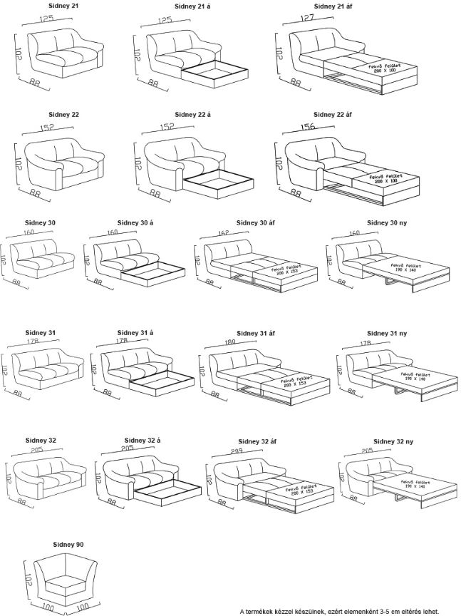 – 3 üléses kanapé: 205 x 102 x 88cm, vendégágy fekvőfelület méret 200 x 153cm, vagy 190 x 140cm