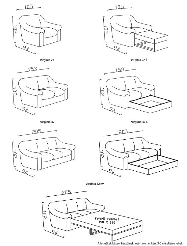 – 3 üléses kanapé: 205 x 102 x 94cm, vendégágy fekvőfelület méret 190 x 140cm