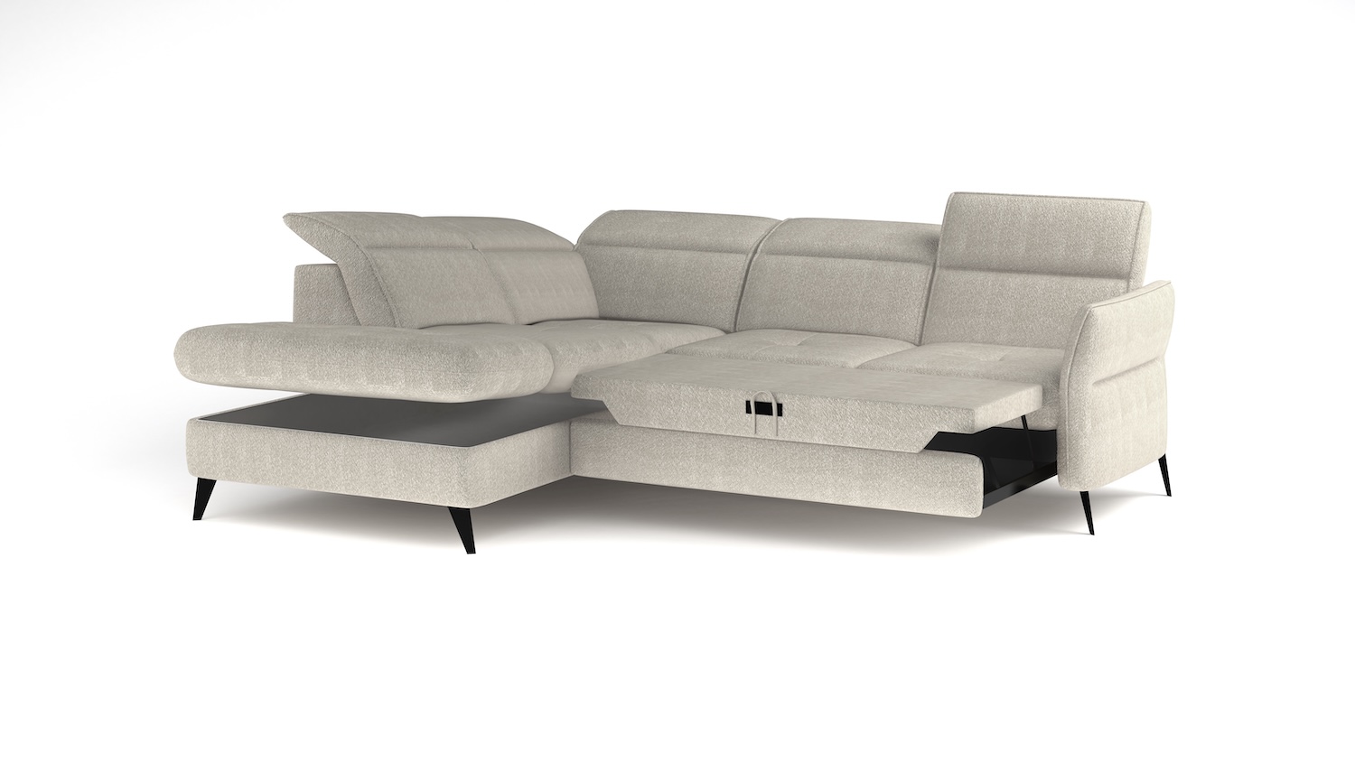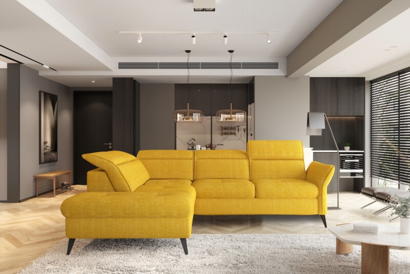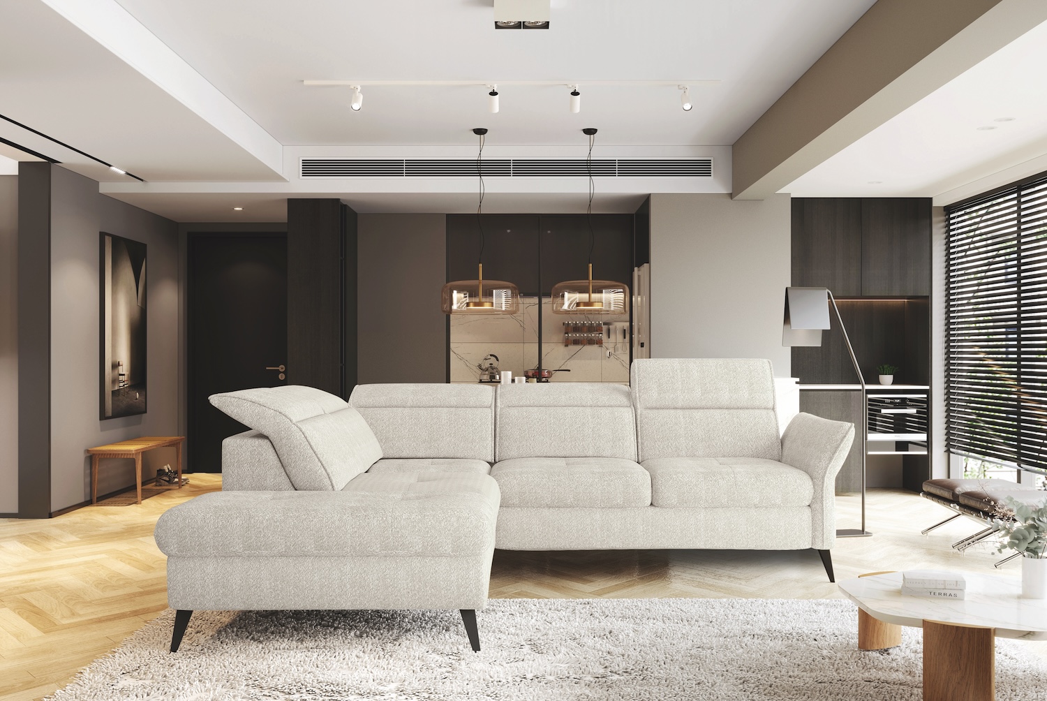 Stílusos megjelenésű sarok ülőgarnitúra kényelmi funkciókkal.
