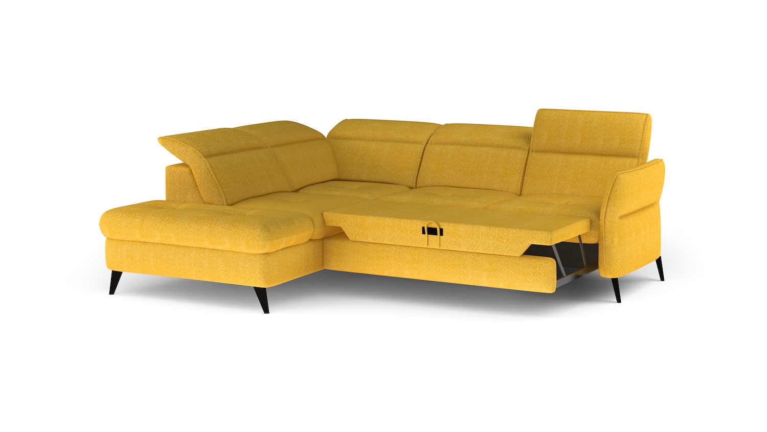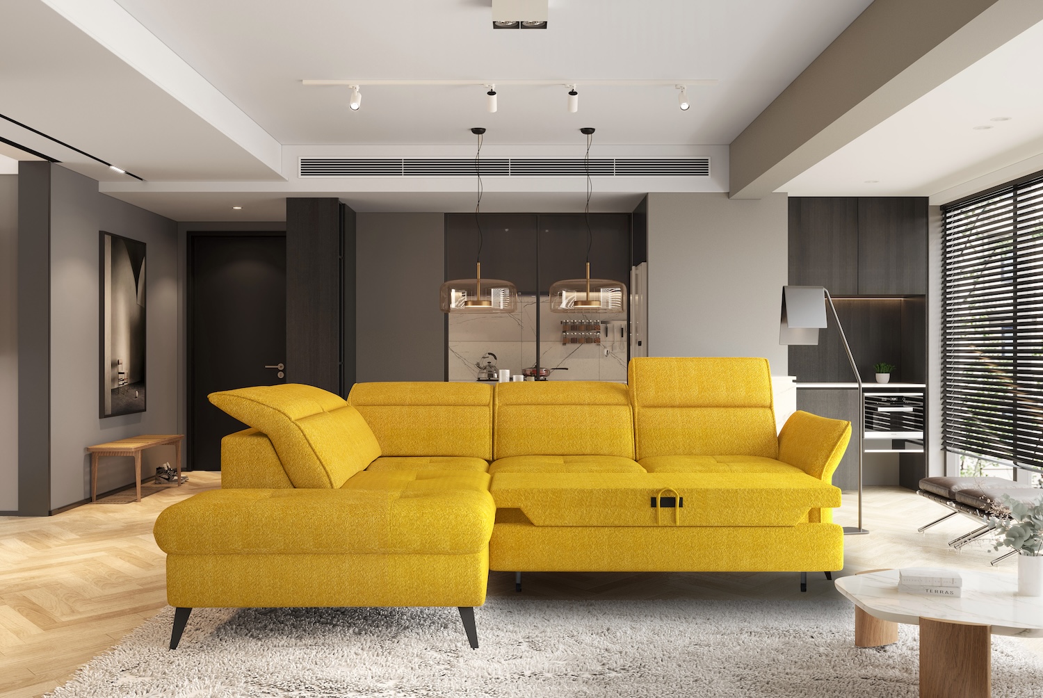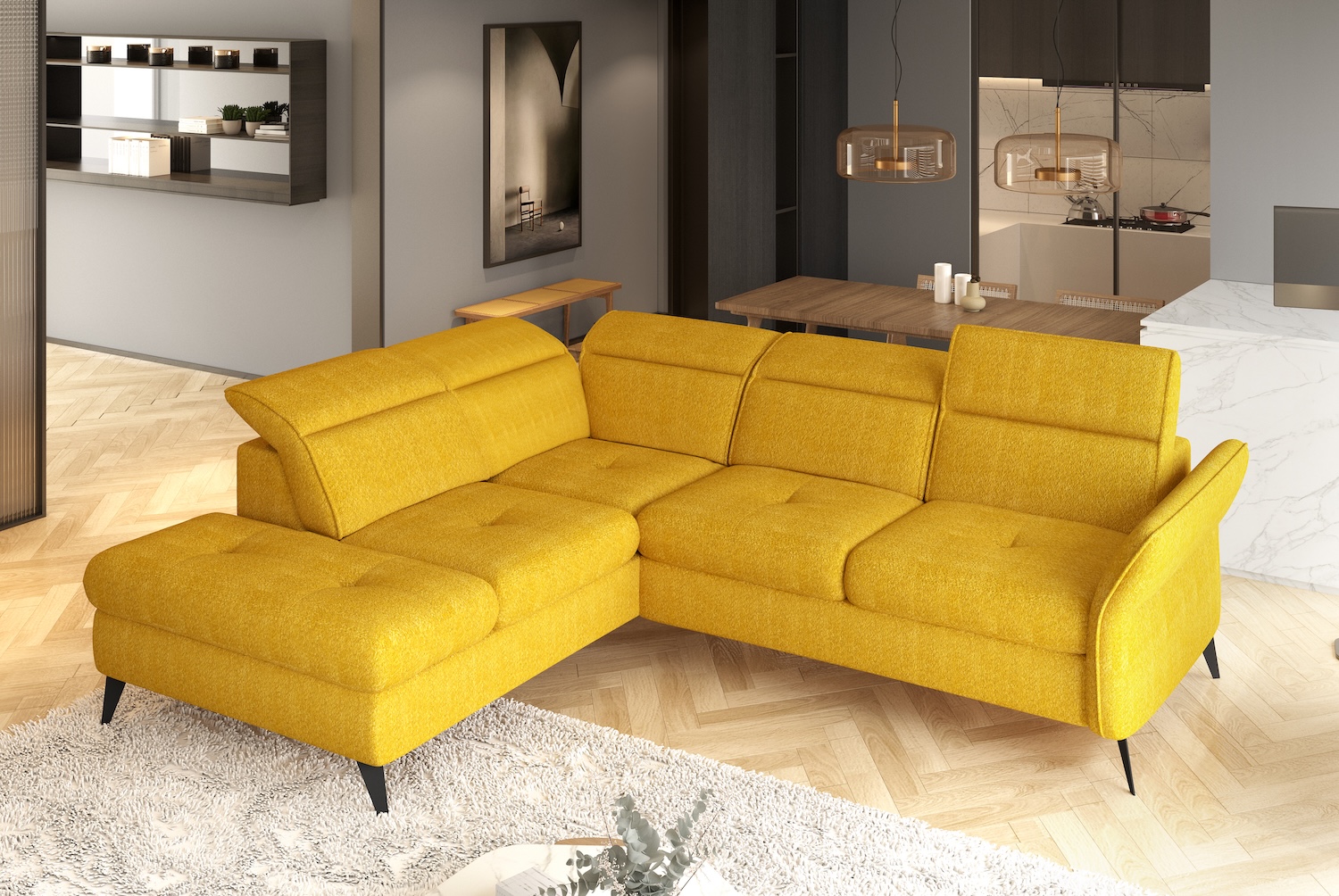 Stílusos megjelenésű sarok ülőgarnitúra kényelmi funkciókkal.