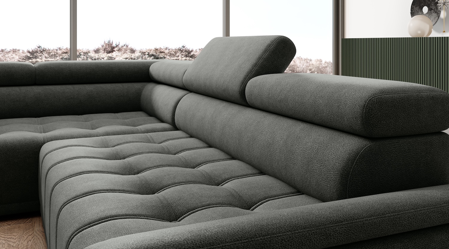 Stílusos megjelenésű sarok ülőgarnitúra kényelmi funkciókkal.