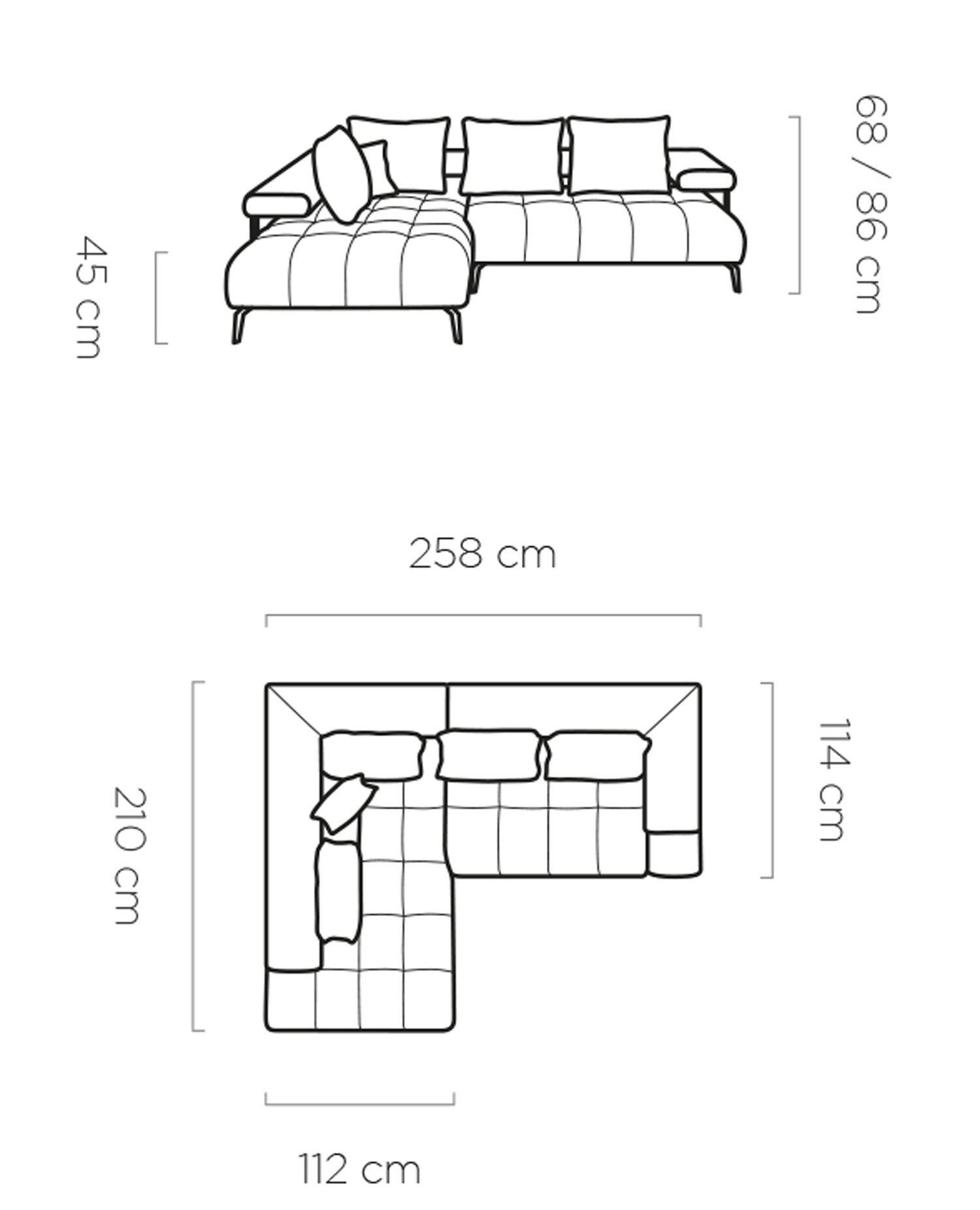 ‘L’: 210 x 258 cm, fekvőfelület: 109 x 198 cm